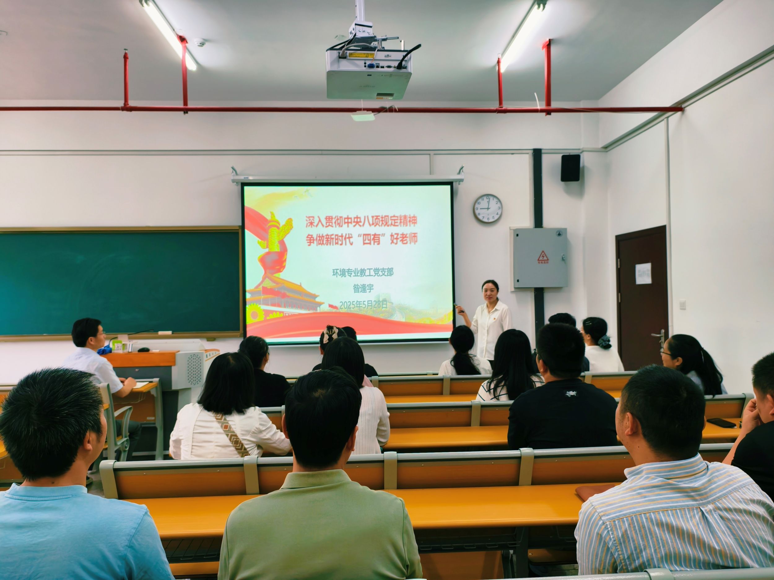 5月28日上午,环境专业教工党支部在清源楼C301召开支部大会,邀请学院副院长昝逢宇教授作题为“深入贯彻中央八项规定精神、争做新时代四有好老师”的专题党课,会议由支部书记陶海升主持。