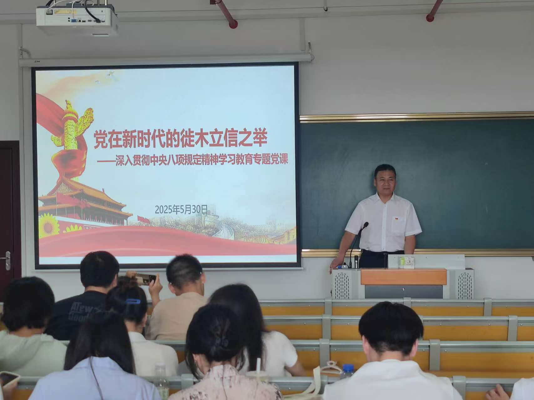 胡好远为支部党员上了题为《党在新时代的徙木立信之举》的专题党课。他介绍了中央八项规定和中央八项规定精神的内容与区别,中央八项规定实施的成效,通报了高校违反中央八项规定精神的典型案例,结合学生实际,详细阐述了学生党员如何落实中央八项规定精神。学习研讨环节,与会党员观看了警示教育片《永远吹冲锋号》视频,全体党员共读了《习近平关于加强党的作风建设论述摘编》第一章的内容。于红梅领学了习近平总书记的重要文章《激励新时代青年在中国式现代化建设中挺膺担当》,倪世春领学了习近平总书记在庆祝中华全国总工会成立100周年暨全国劳动模范和先进工作者表彰大会上的重要讲话精神。研讨交流环节,五位党员结合学习、工作、生活情况作研讨发言。