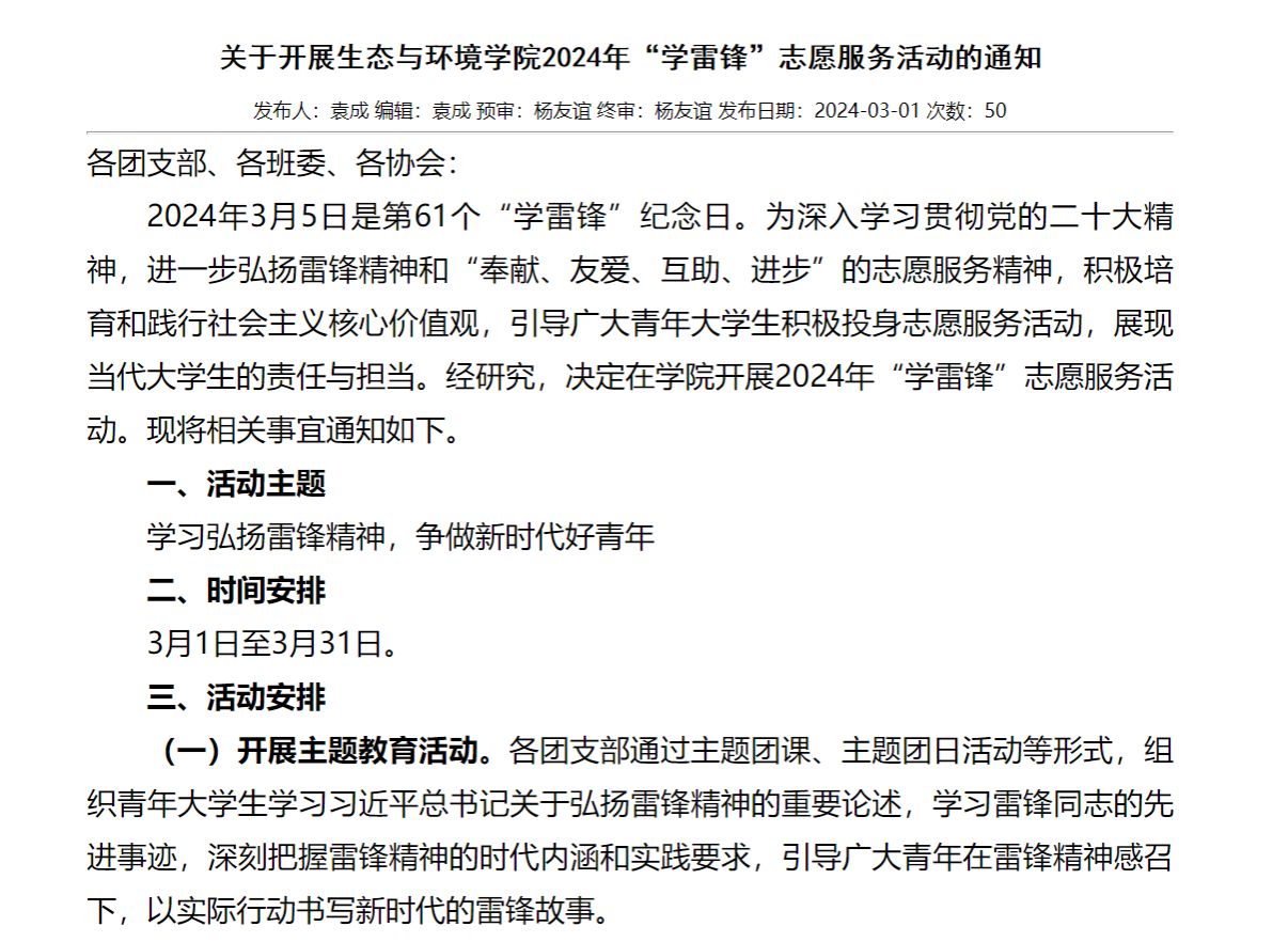 为深入学习贯彻党的二十大精神,进一步弘扬雷锋精神,积极培育和践行社会主义核心价值观,引导广大青年大学生积极投身志愿服务活动,展现当代大学生的责任与担当。生环学院响应学校号召,分层次、分年级开展学雷锋志愿服务活动。