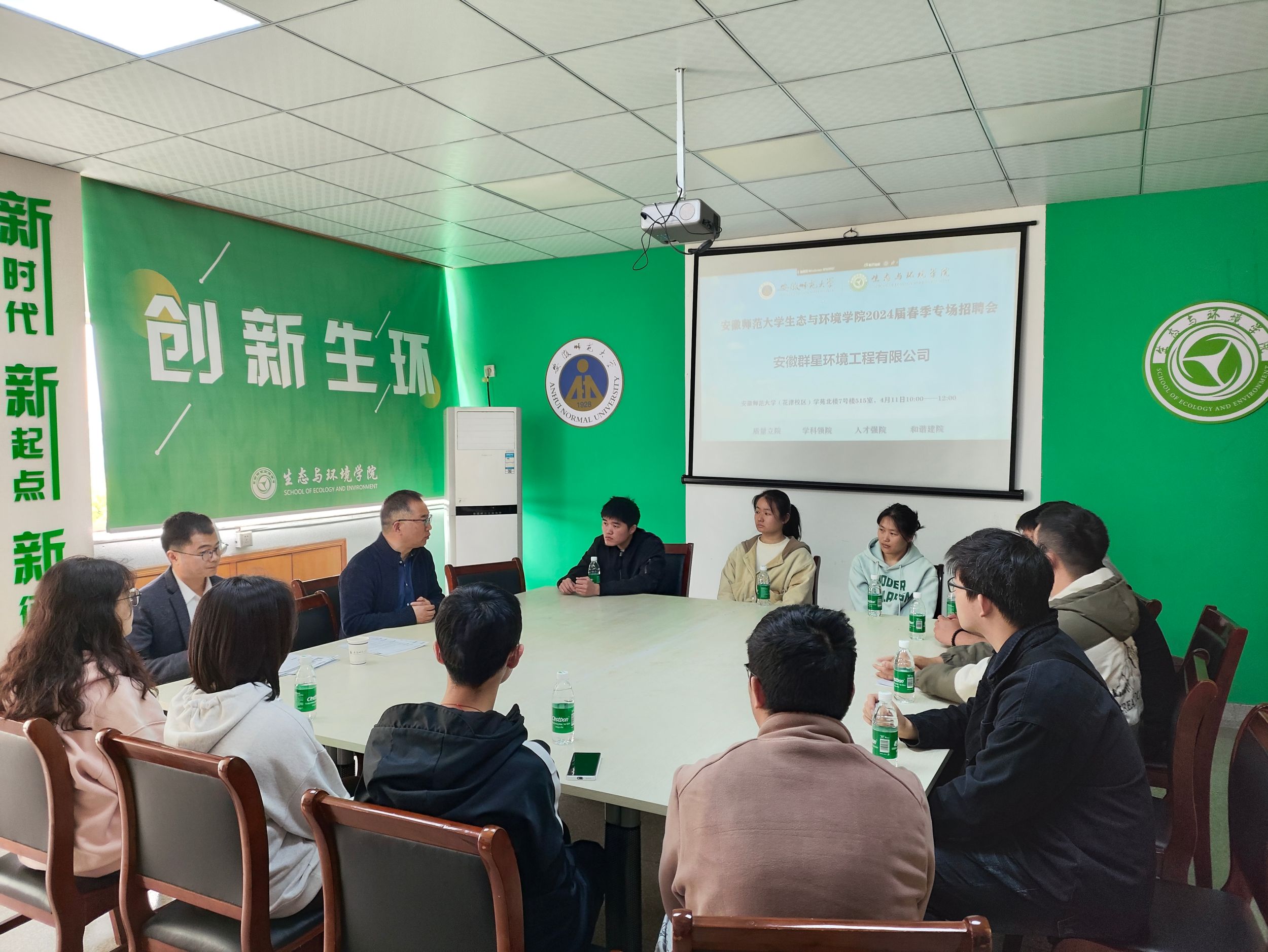 4月11日上午,安徽群星环境工程有限公司应邀在学院行政楼五楼会议室举行专场招聘会,公司执行董事程鸣、总经理方志男、人事负责人王莹与学院本、硕毕业班学生应聘同学交流。