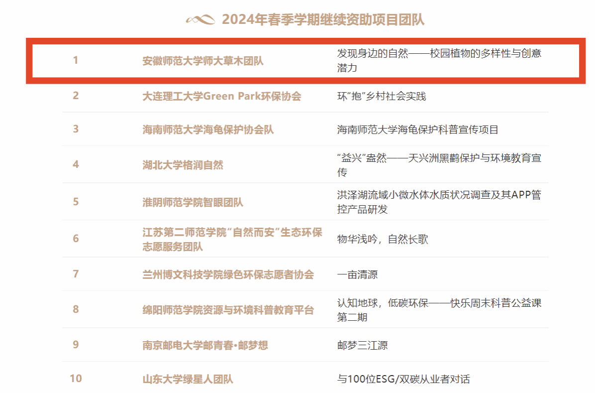 4月22日,涓流行动“一个长江”大学生环保活动资助计划第4期名单公示,金沙城js9线路检测中心蒲公英环保协会与2022级生态学专业植物兴趣小组以“发现身边的自然--校园植物的多样性与创意潜力”为题,再次申报成功并获活动资助。