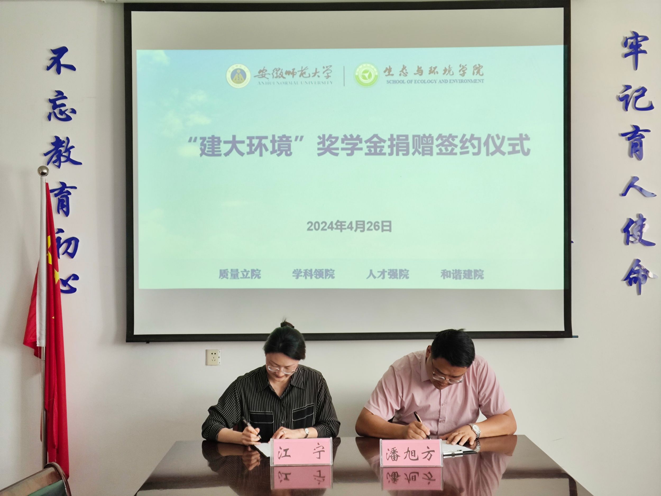 4月26日下午,由安徽建大环境科技有限公司在生态与环境学院设立的“建大环境”奖学金捐赠签约仪式在学院四楼会议室举行。安徽建大环境科技有限公司总经理潘旭方,副总经理沈刚,校教育基金会副秘书长、社会合作处副处长江宁,学院院长胡好远、副书记杨友谊、生态学专业负责人项贤领、副教授程新峰出席签约仪式,仪式由杨友谊主持。