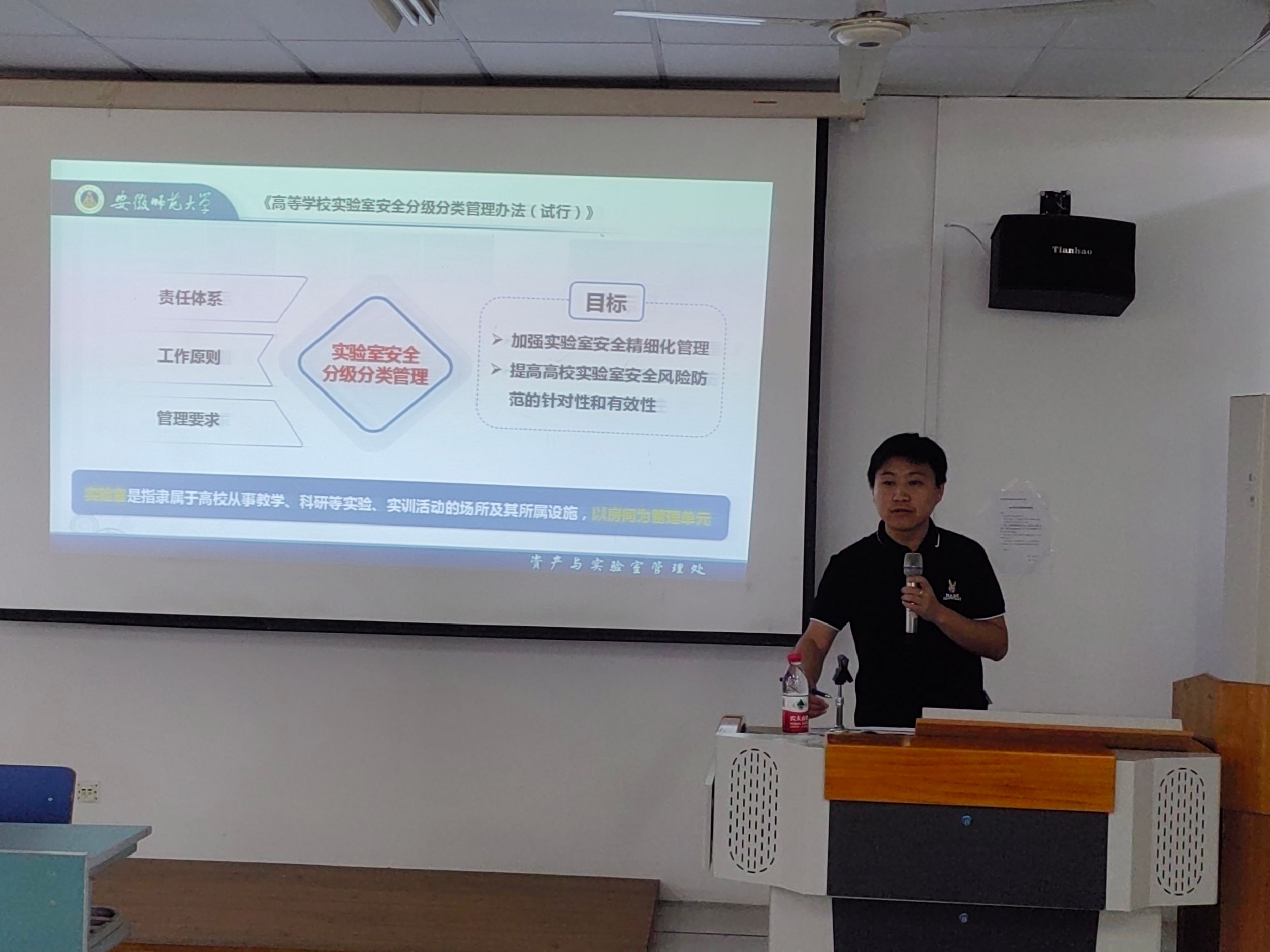 为认真落实实验室安全分级分类工作,5月8日下午,学院邀请资产与实验管理处李硕林科长在实验楼201教室进行专题培训,学院党政领导、实验中心教师、各实验室负责人和研究生代表参加了此次培训,培训由副院长甘为民主持。