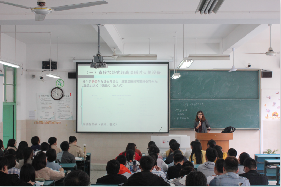 授课伊始,李老师以食品中常见的致病菌为引入点,引导学生了解杀菌在食品加工中的重要性,并以常见的食品罐头、牛奶为例,形象生动地阐释了杀菌中两种典型的杀菌方式。整个教学过程中,李老师按照从原理——实例的教学方法,循序渐进地介绍了从产品到工艺到设备和设备原理构成等内容。李老师运用了板书、多媒体课件、课堂互动等多种教学手段,善于将理论知识和生产生活实际联系起来,加深了学生对知识的理解,激发了学生的学习兴趣,展示了良好的教学技能和较强的教学功底。