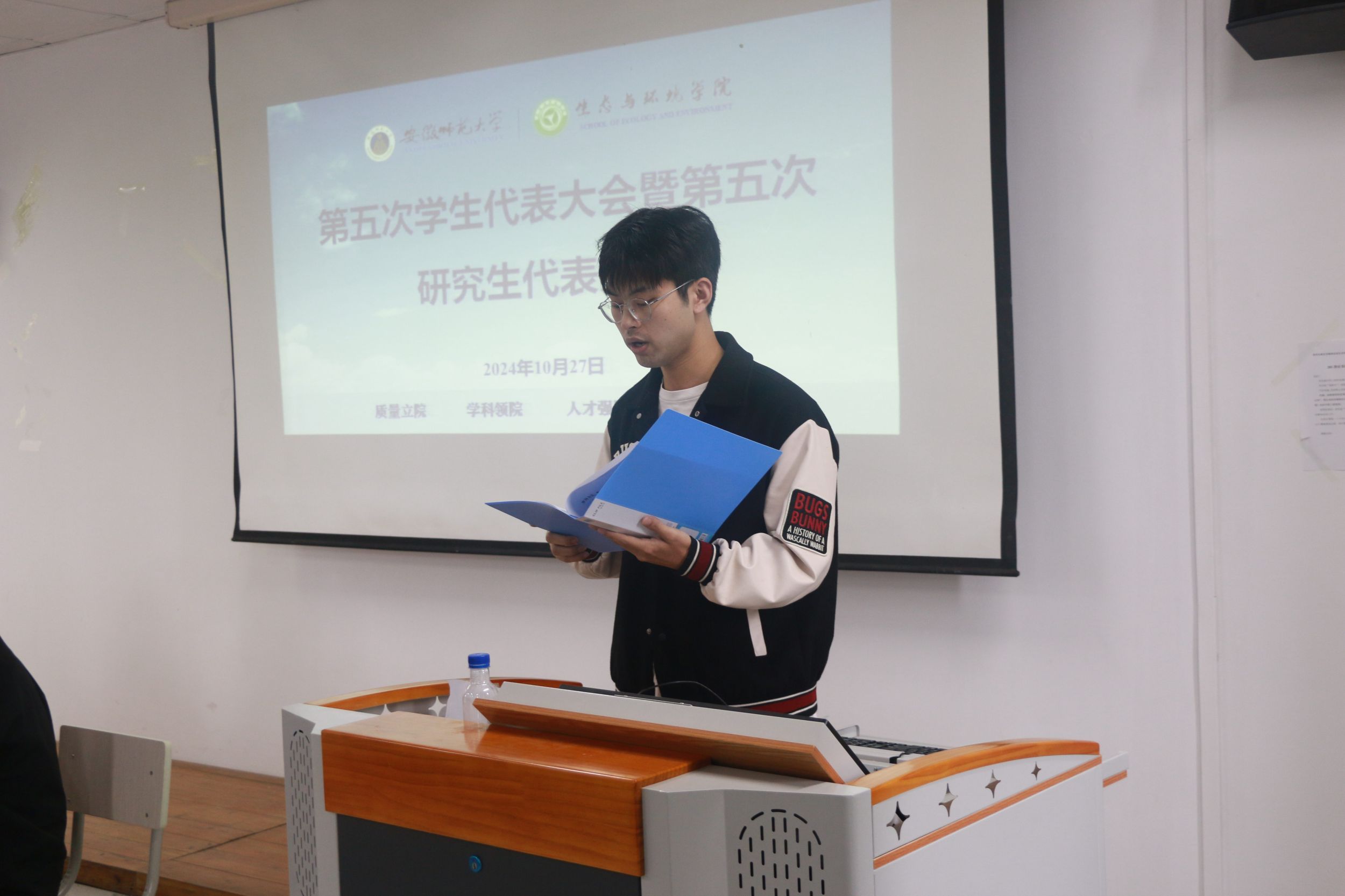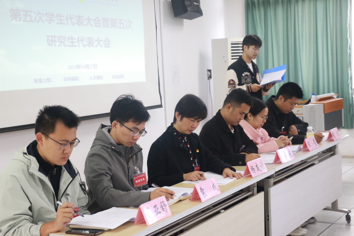 10月27日上午,金沙城js9线路检测中心第五次学生代表大会暨第五次研究生代表大会在实验楼201召开。学院党委副书记杨友谊,团委书记胡坡,团委副书记屈亚舒,辅导员郑合庆、袁成、王莹,来自学院各年级的90余名学生代表、研究生代表参加会议。