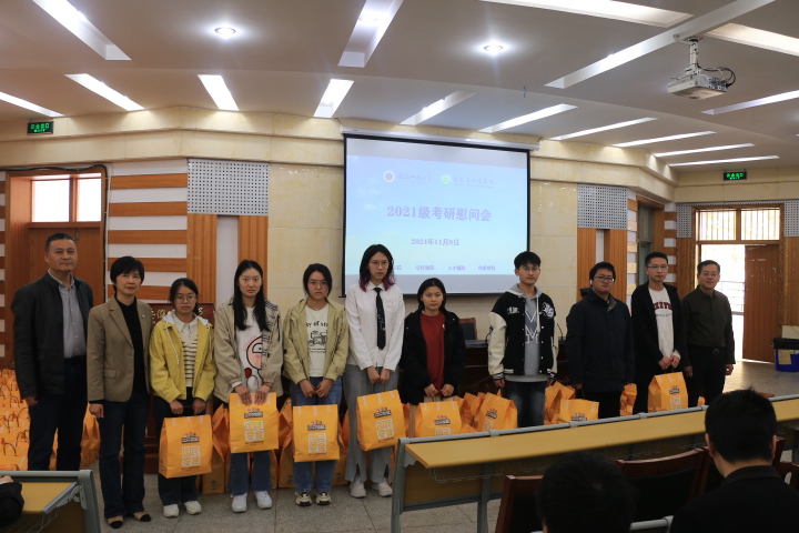 11月8日下午,学院在学苑8号楼副二楼报告厅召开2021级学生考研慰问会。学院党委书记张伟、院长胡好远、党委副书记杨友谊、辅导员胡坡和2021级考研同学参加本次会议。