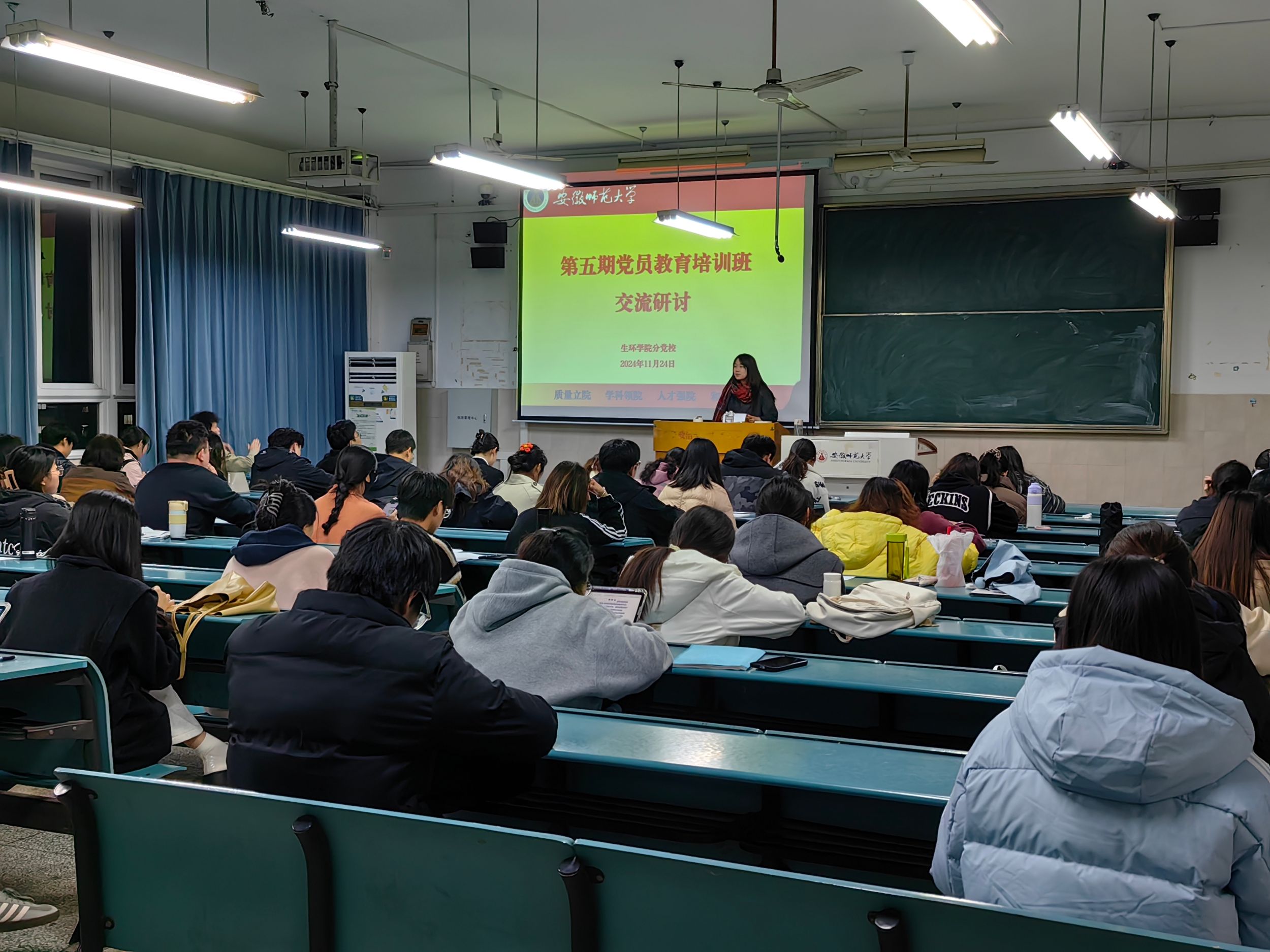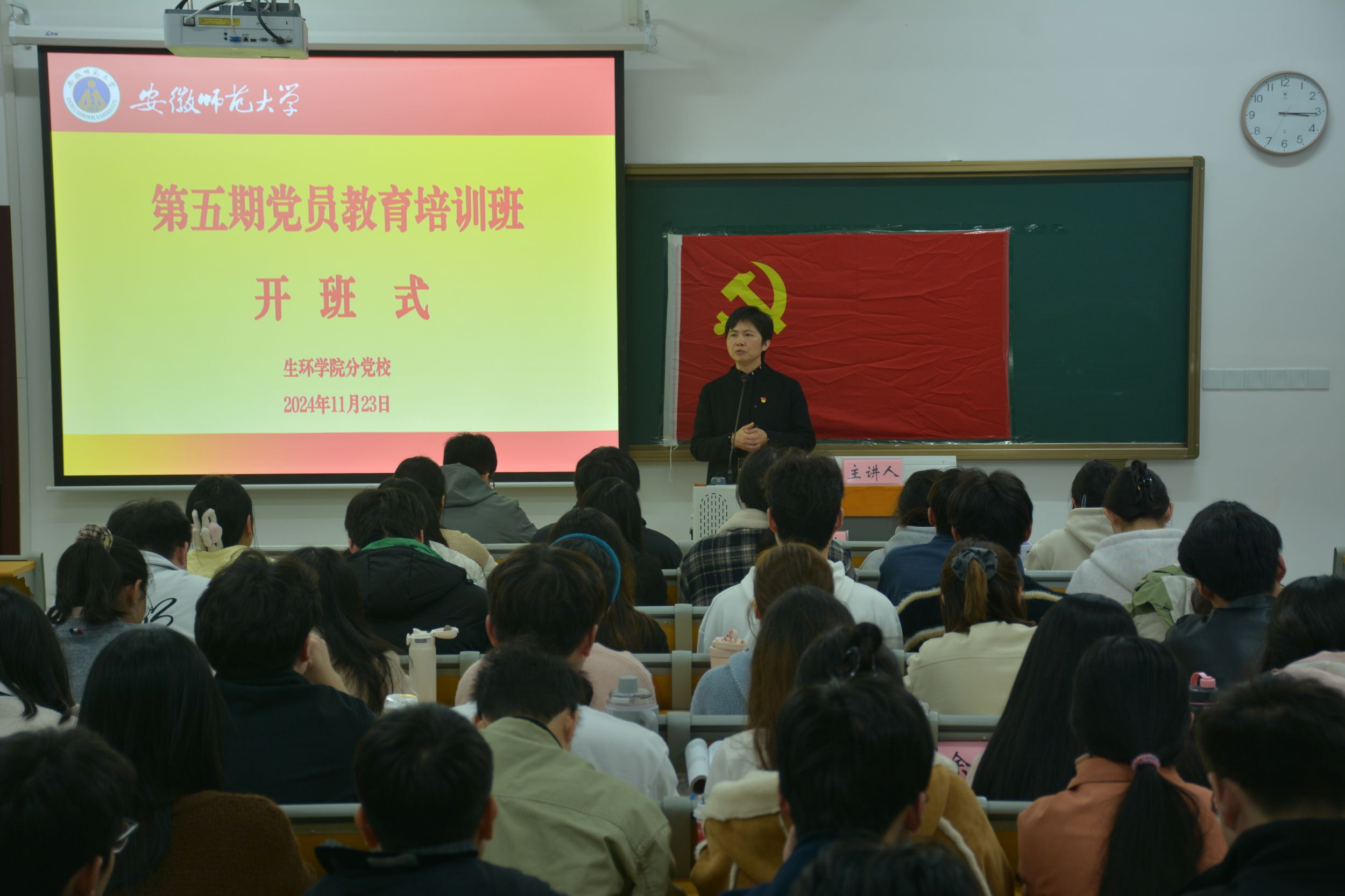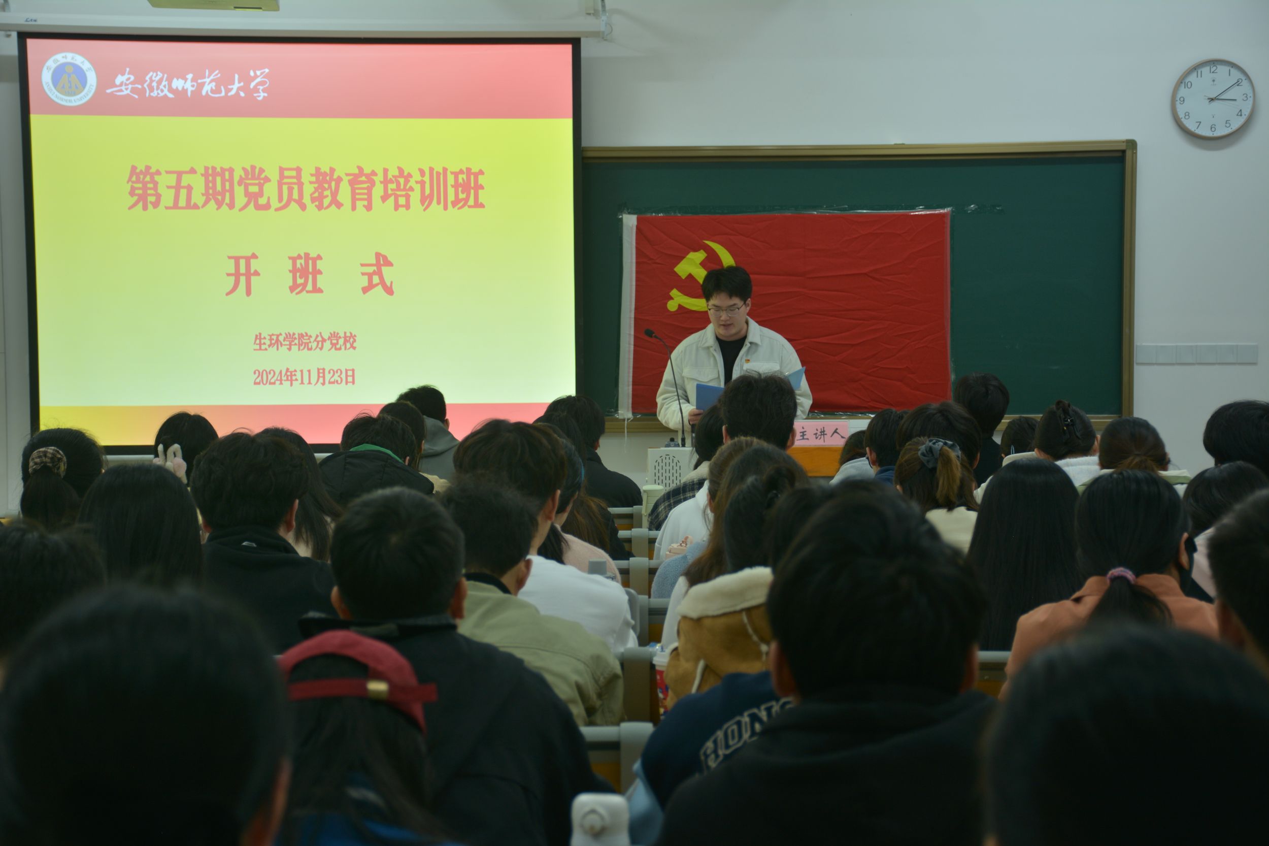 系统学习,突出重点。11月23日上午,培训班开班典礼在清源楼C308教室举行。学院党委副书记杨友谊、党校班主任袁成及培训班全体学员参加开班典礼,仪式由袁成主持。袁成介绍了培训内容、形式、教学安排和班级管理制度;2022级环境科学专业赵鑫同学作为学员代表发言;杨友谊强调了培训班的纪律问题,要求学员们保持良好的学风,严格要求自己,把内在要求转化为外在行动。培训期间,马克思主义学院教授路丙辉作题为《我们共产党人》、马克思主义学院教授沈燕培作题为《深入学习贯彻党的二十届三中全会精神》、马克思主义学院副教授杨希作题为《精神·榜样·接力:百年大党正年轻》、新闻与传播学院党委副书记、纪委书记吴青山作题为《学习条例,严守纪律,做新时代合格学生党员》的党课报告。培训班还视频学习了《习近平在全国教育大会上发表重要讲话》《习近平在全国民族团结进步表彰大会上发表重要讲话》并就《习近平总书记考察安徽重要讲话精神》开展主题研讨交流。