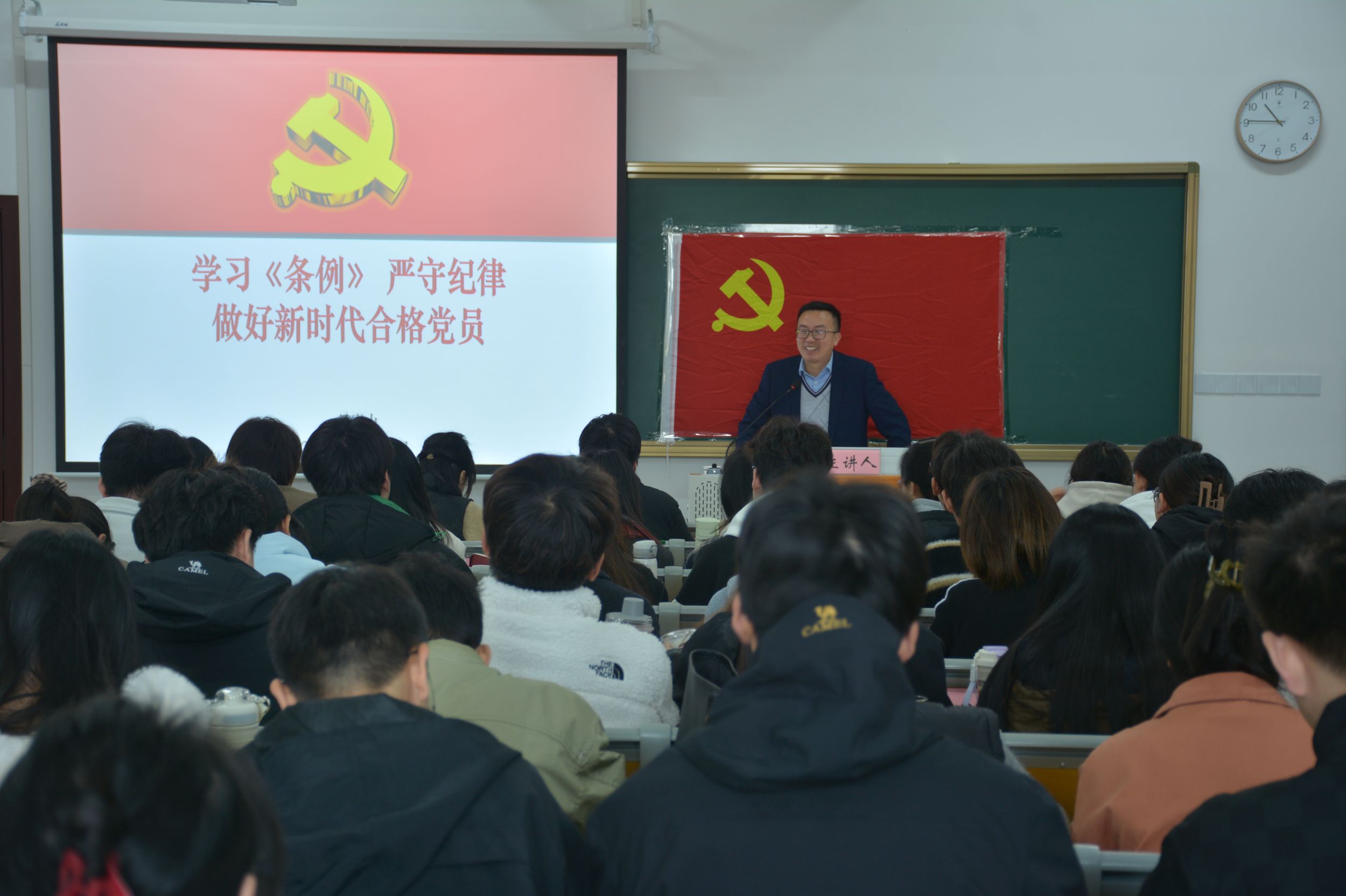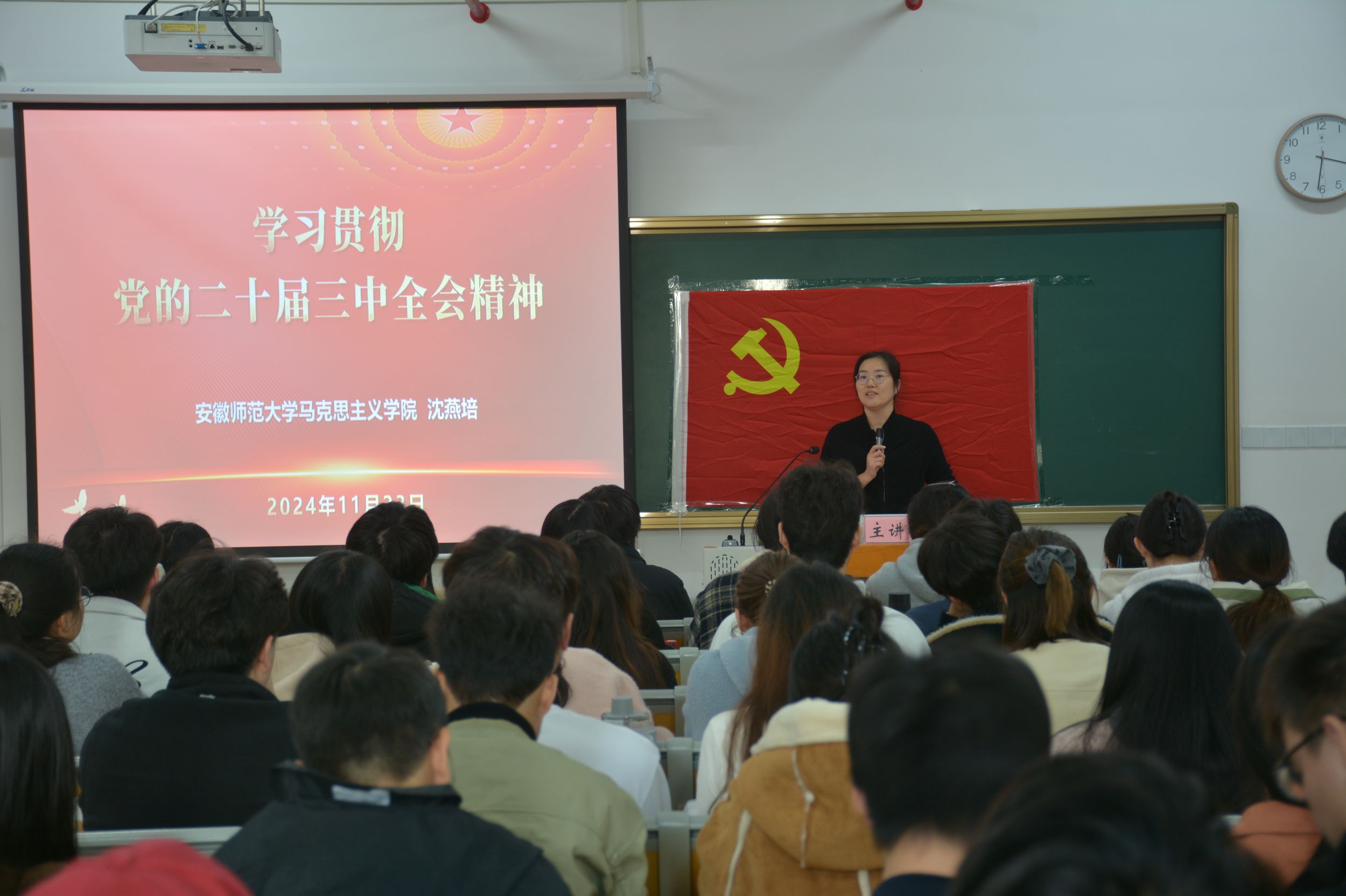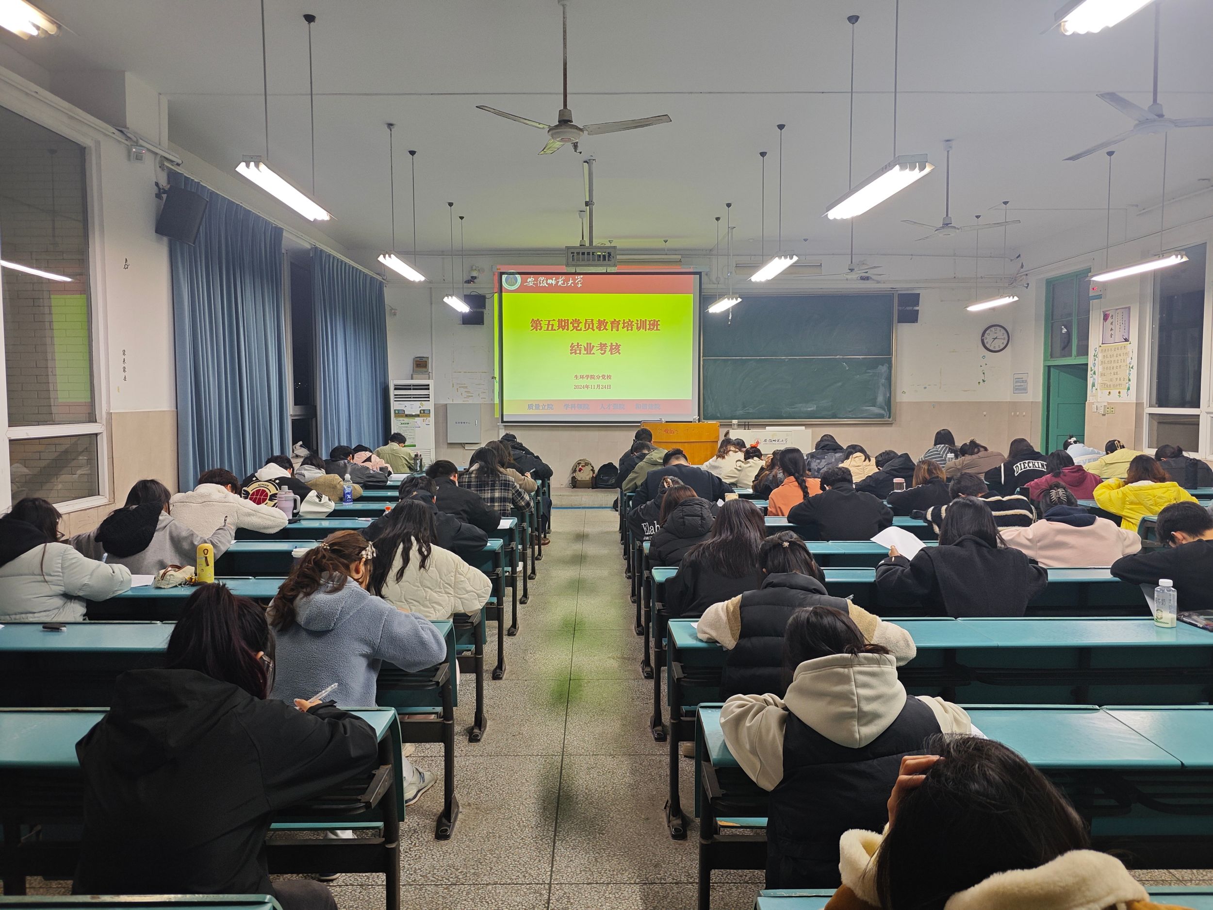 系统学习,突出重点。11月23日上午,培训班开班典礼在清源楼C308教室举行。学院党委副书记杨友谊、党校班主任袁成及培训班全体学员参加开班典礼,仪式由袁成主持。袁成介绍了培训内容、形式、教学安排和班级管理制度;2022级环境科学专业赵鑫同学作为学员代表发言;杨友谊强调了培训班的纪律问题,要求学员们保持良好的学风,严格要求自己,把内在要求转化为外在行动。培训期间,马克思主义学院教授路丙辉作题为《我们共产党人》、马克思主义学院教授沈燕培作题为《深入学习贯彻党的二十届三中全会精神》、马克思主义学院副教授杨希作题为《精神·榜样·接力:百年大党正年轻》、新闻与传播学院党委副书记、纪委书记吴青山作题为《学习条例,严守纪律,做新时代合格学生党员》的党课报告。培训班还视频学习了《习近平在全国教育大会上发表重要讲话》《习近平在全国民族团结进步表彰大会上发表重要讲话》并就《习近平总书记考察安徽重要讲话精神》开展主题研讨交流。