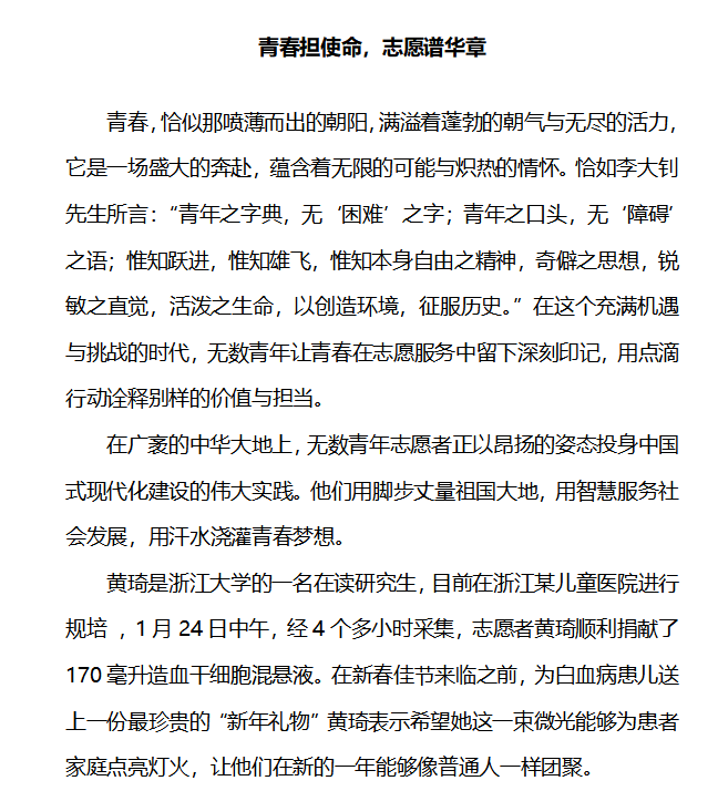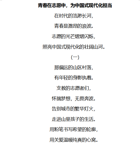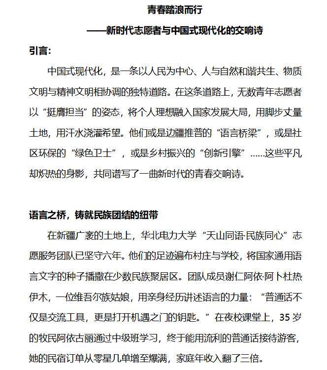青春创作,筑牢理想信念。金沙城js9线路检测中心学子以“青春为中国式现代化挺膺担当”为主题,编写小说、剧本、诗歌、散文等,形成相关作品80余篇,作品内容展现了新时代新征程志愿者投身中国式现代化建设的积极作为和青春风采,弘扬志愿精神,传播志愿文化。