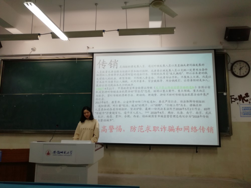 各年级辅导员在班会前认真准备并整理了传销和非法集资的相关材料,详细认真的向学生们进行了传达与教育。 在班会上,辅导员结合实例向学生讲述了传销和非法集资的过程以及此类不良活动的危害,之后强调了识别与防范传销和非法集资的方式方法。
