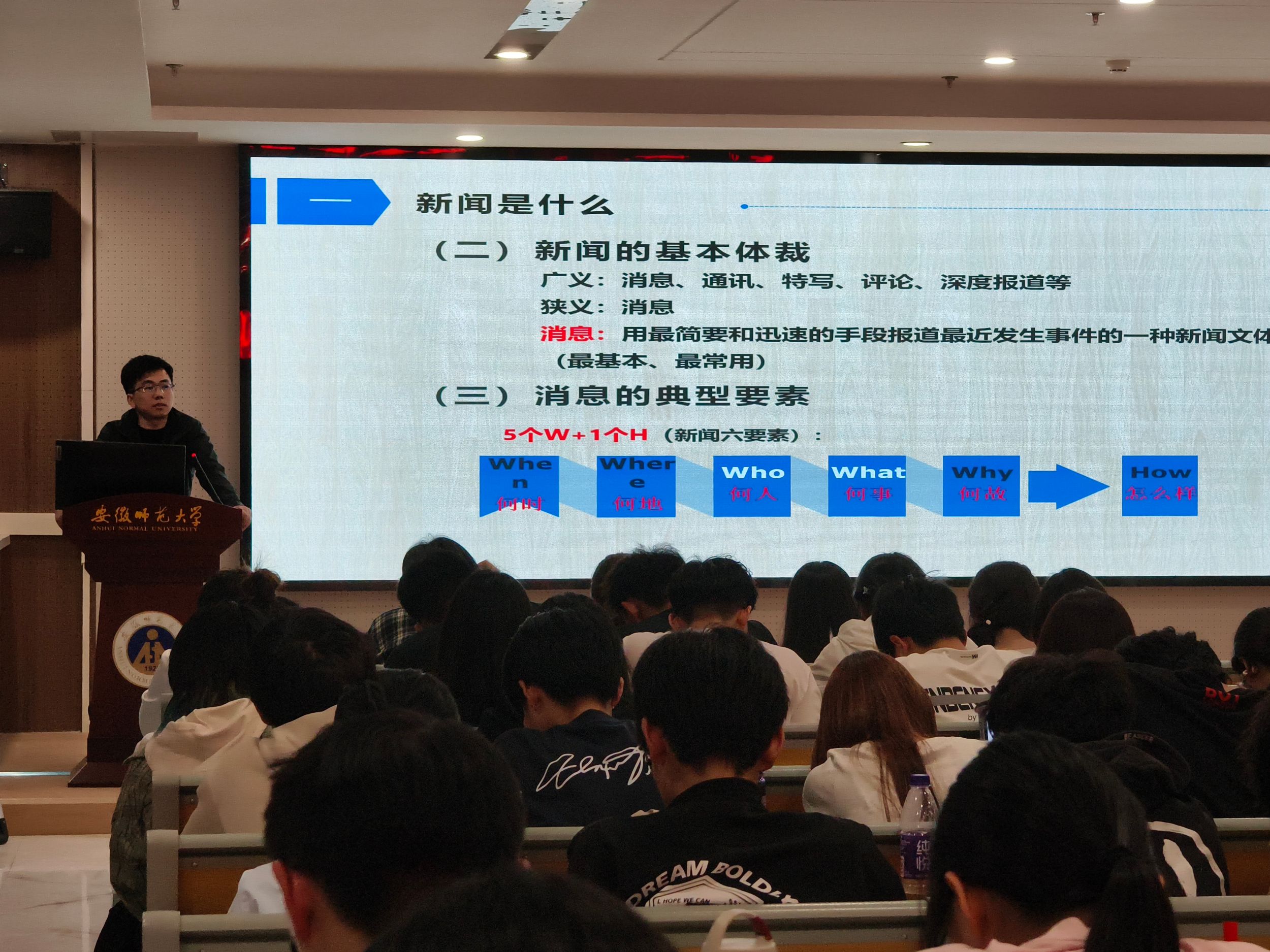 随后,袁成老师围绕校园新闻写作,从新闻是什么、新闻怎样写、新闻写什么、存在的问题等四个方面向同学们展开介绍,并就学生如何撰写新闻稿提出建议,希望同学们按照新闻稿件的书写要求,多练多写,努力提升自身能力,提高工作技能。