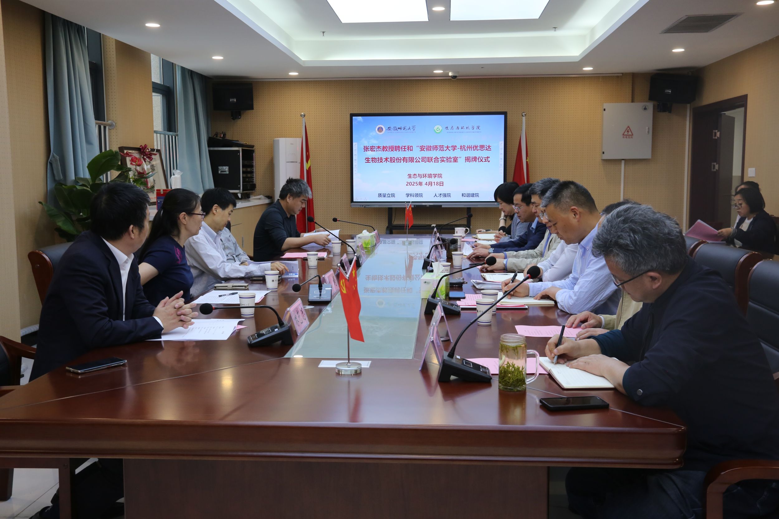 张宏杰和李宜江共同签署了聘任协议书。随后,与会人员前往实验室举行了专家工作室和“安徽师范大学-杭州优思达生物技术股份有限公司联合实验室”揭牌仪式。
