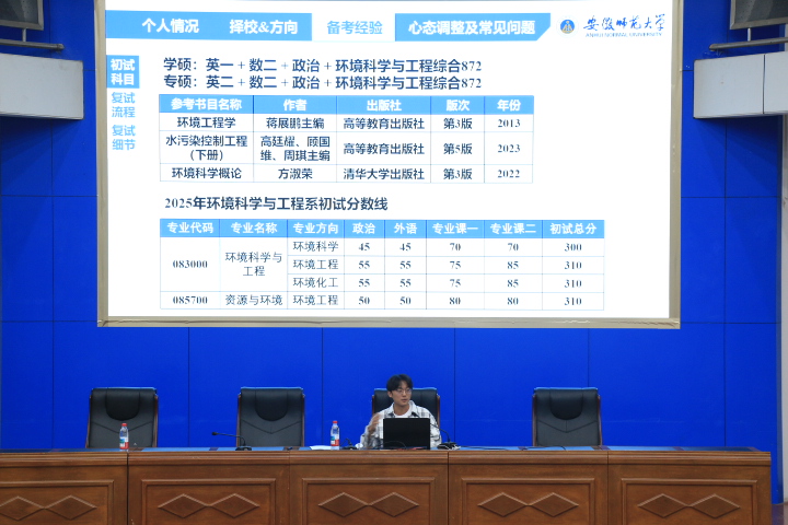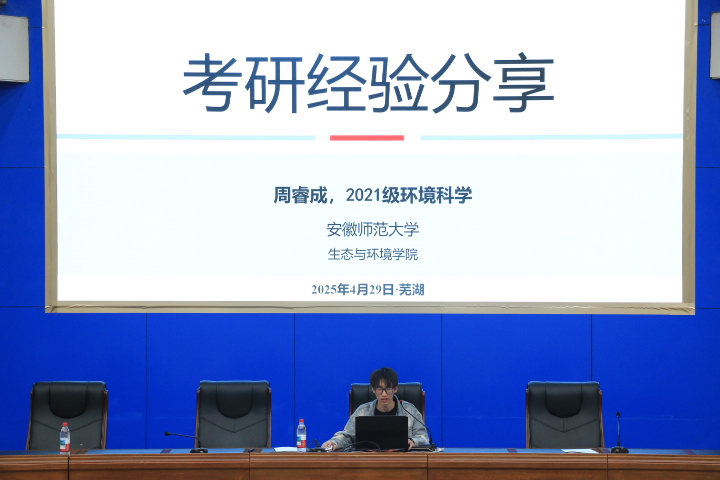 经验交流分享环节,郑合庆介绍了学院各专业近几年的升学情况,结合考研率、录取院校等重点对考研择校等进行分析,并提出了相关建议。2025届毕业生周睿成、高江锐、叶明、杨露、张圣彬、姚思萌从备考经验、复试经验、调剂经验、心态调整等方面进行了分享。