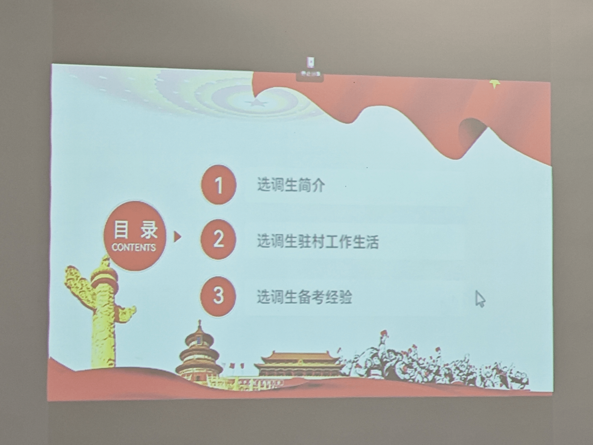 2023届优秀校友丁茂围绕选调生备考主题,简要介绍了选调生选拔的意义、要求,并结合自身工作实际,详细介绍了选调生驻村工作生活的工作要求。丁茂与现场的同学重点分享了选调生备考经验,详细讲解了四套选调生备考笔试题型以及备考策略,并建议同学们奋进正当时,做新时代为国为民的新青年。