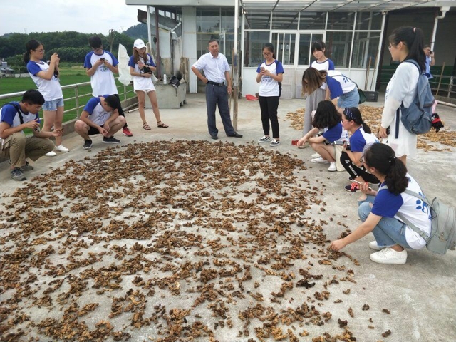 所谓粗加工,其实主要就是将刚挖出的鲜黄精清洗干净,进行晒干,切片和磨粉等操作,由于季节原因,队员们没能看到刚出土的鲜黄精,但经过初步晾晒的半干黄精仍然给大家留下了深刻的印象。刚走上天台,浓浓的黄精的药香味就扑面而来。黄精药材公司的总经理吴振东先生表示,由于季节不同,晾晒黄精所需的时间也是不同的,像现在这样火辣的太阳,大概只需要一个多星期,鲜黄精就完全可以被晾干,如果在深秋或是冬天,可能得需要将近一个月的时间。相关工作人员带大家看了一些黄精片等粗加工制品,让大家学到了很多书本以外的知识。