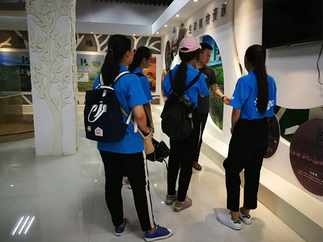 由于处于夏季,升金湖又处于丰水期,所以没法实地考察到升金湖的绝大多数鸟类,工作人员带领我们团队来到了位于管理局一楼的展厅进行详细的讲解。进入展厅后,队员们便被展厅内种类和数量丰富的鸟类标本所吸引,在工作人员的耐心讲解下,队员们听得全神贯注,在了解到升金湖内有白头鹤、白鹤、东方白鹳、白琵鹭、灰鹤、白枕鹤、小天鹅、白额雁、豆雁、鸿雁、小白额雁等重点及国家级重点保护鸟类以后,队员们在一边暗自惊叹的同时,一边默默决定要凭借自己的努力,保护我们和生物们共同生活的家园。最后,队员们在展厅门前拍照合影。