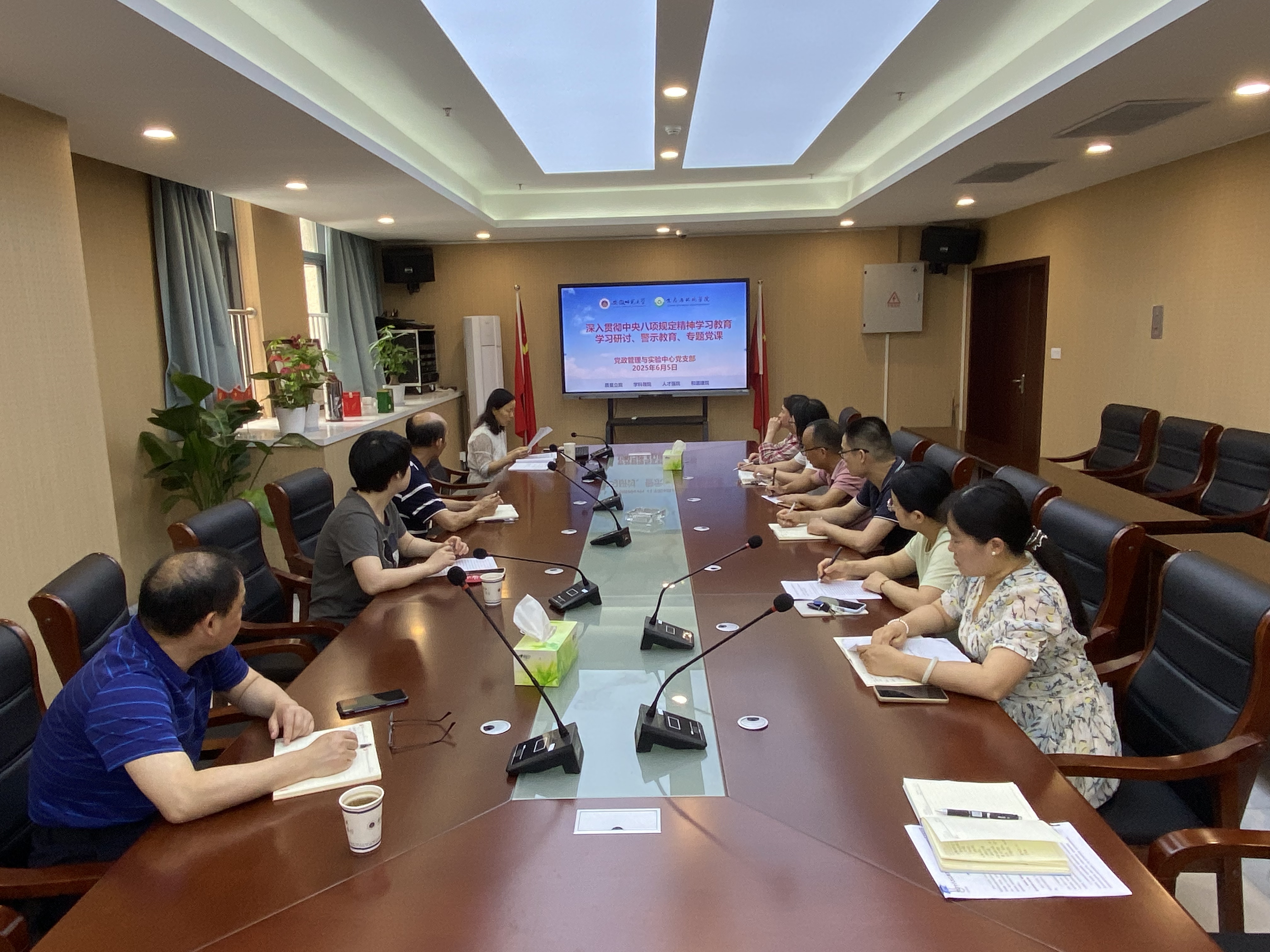 6月5日上午,党政管理与实验中心党支部在清源楼B305会议室开展深入贯彻中央八项规定精神学习教育学习研讨、警示教育和专题党课,支部全体党员参加了会议。会议由支部书记卫正梅主持。