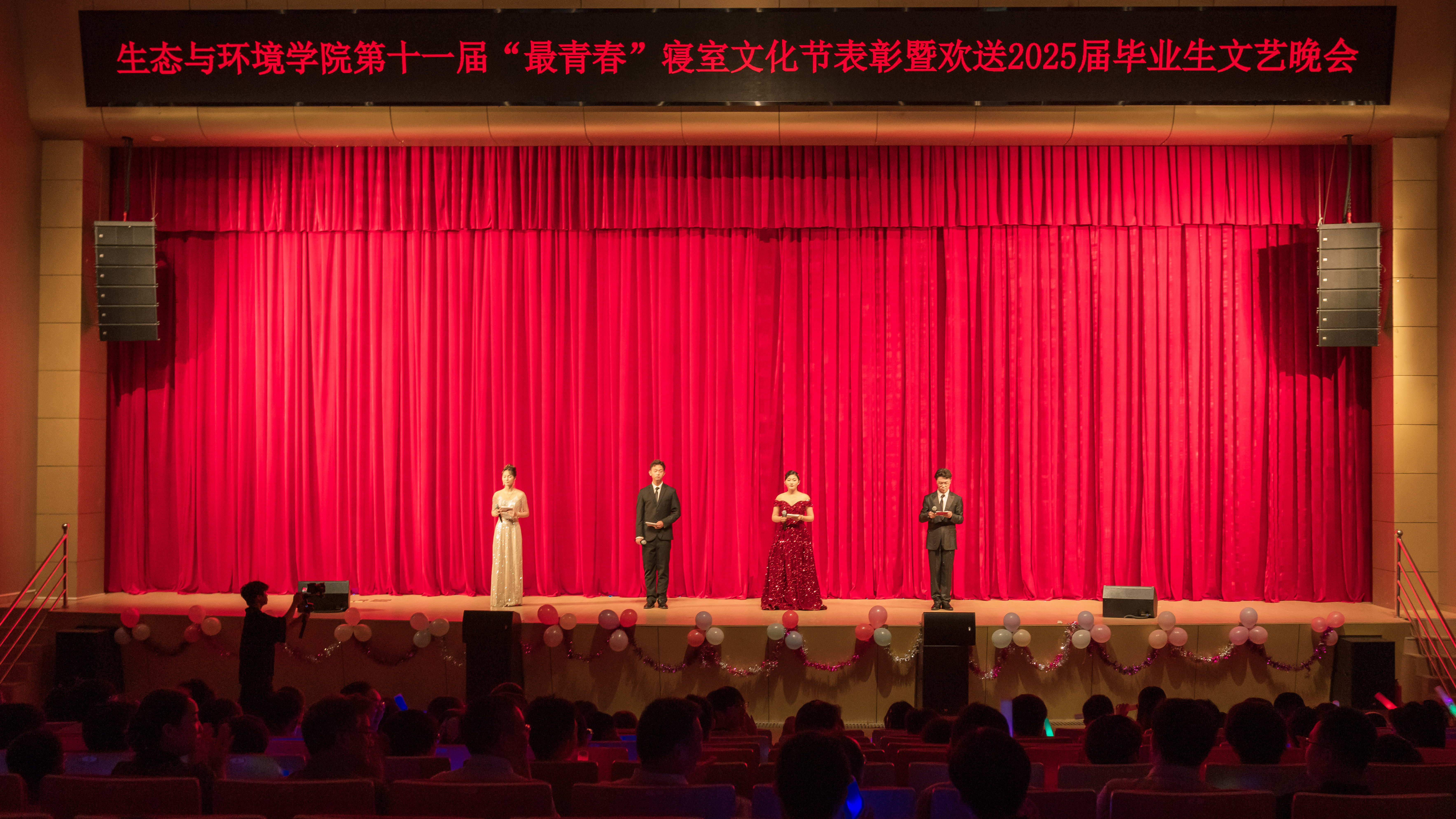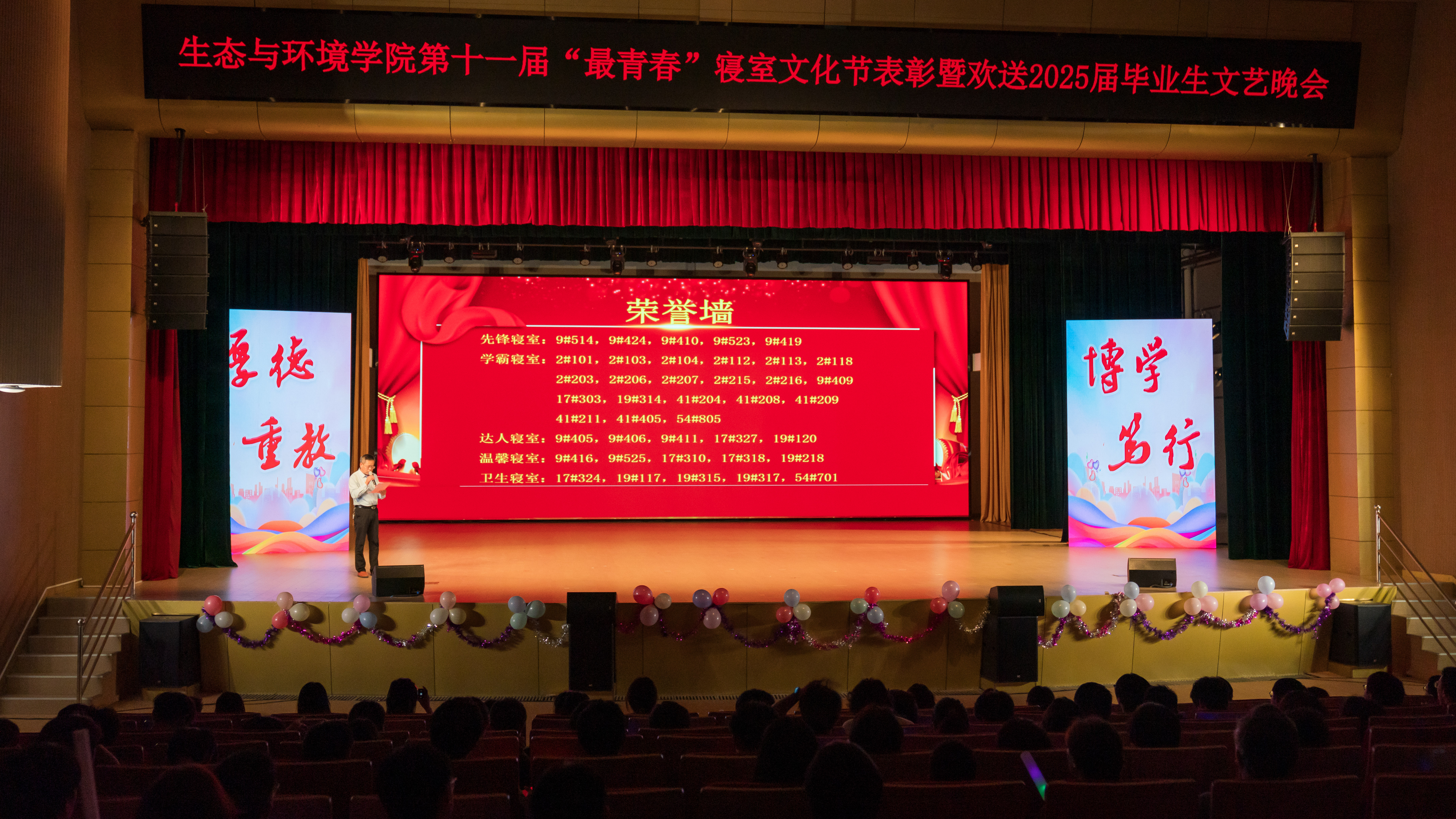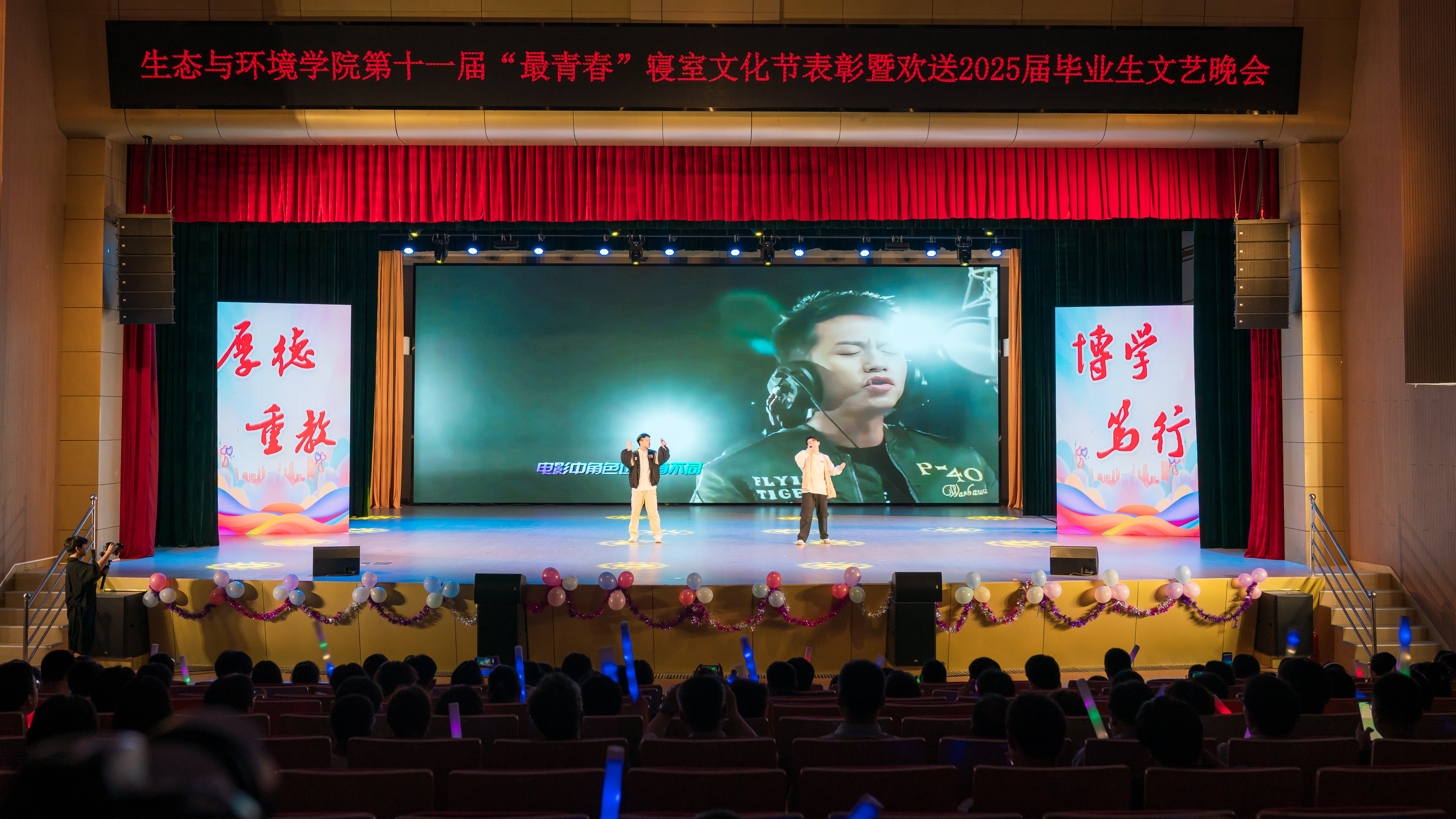 “'生'逢盛世、'环'抱梦想”,为深入推进大学生护航行动,6月7日晚,学院于花津大礼堂隆重举行第十一届“最青春”寝室文化节表彰暨欢送2025届毕业生文艺晚会。安徽建大环境科技有限公司副总经理沈刚,学院领导班子成员、各专业负责人、授课教师和部分本科生、研究生齐聚一堂,共同见证这场青春盛会。