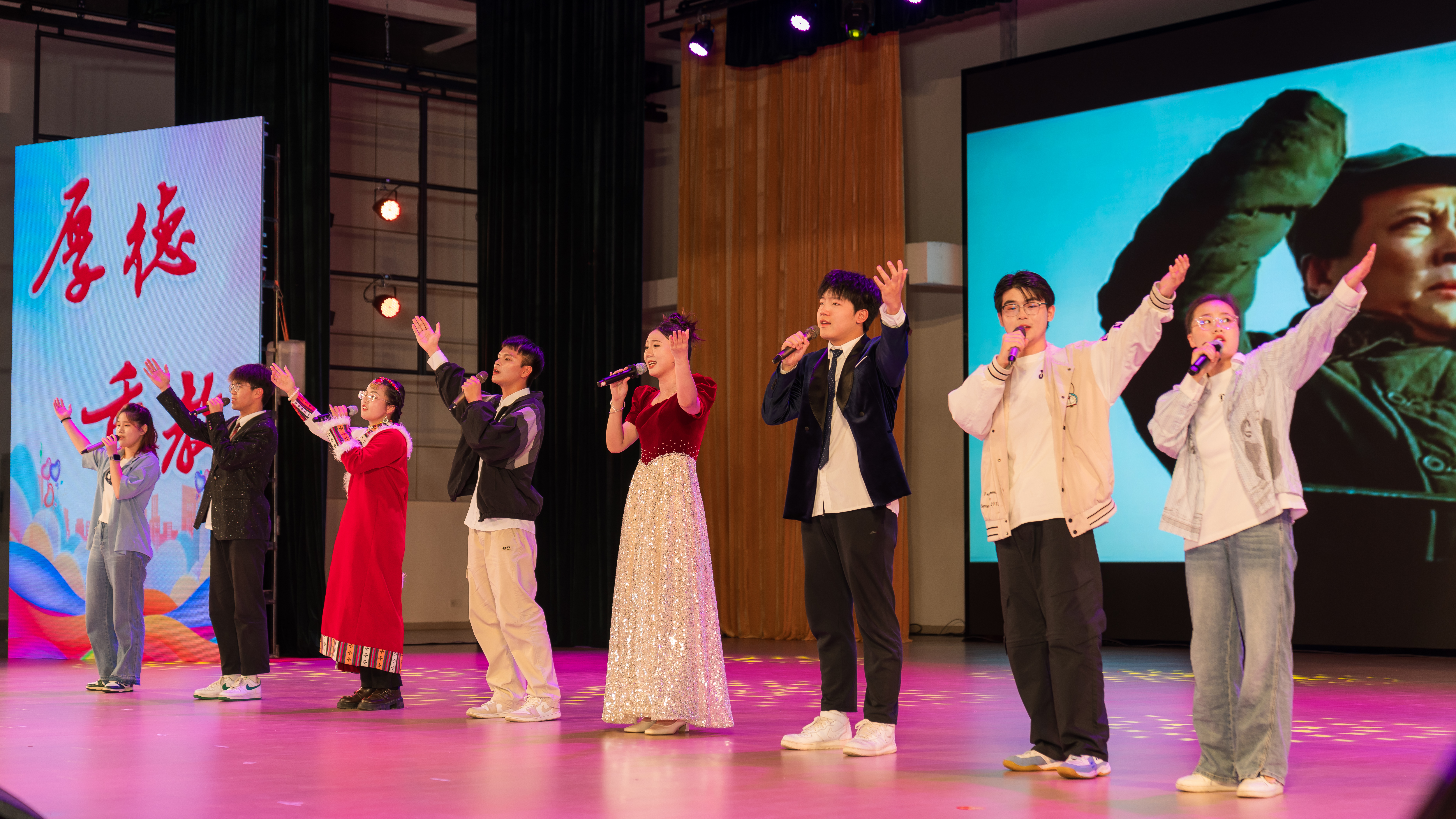 舞蹈《小城谣》,水袖轻摇、舞姿曼妙,尽显东方美学神韵,宛如千年文化的优雅回响;小品《谁杀死了周日》以拟人化的独特手法幽默诙谐地展现当代大学生的拖延现象,在笑声中引发深刻思考;民谣歌曲《阿刁》婉转低回的倾诉与激情澎湃的高歌相互交织,将现场气氛推向高潮。