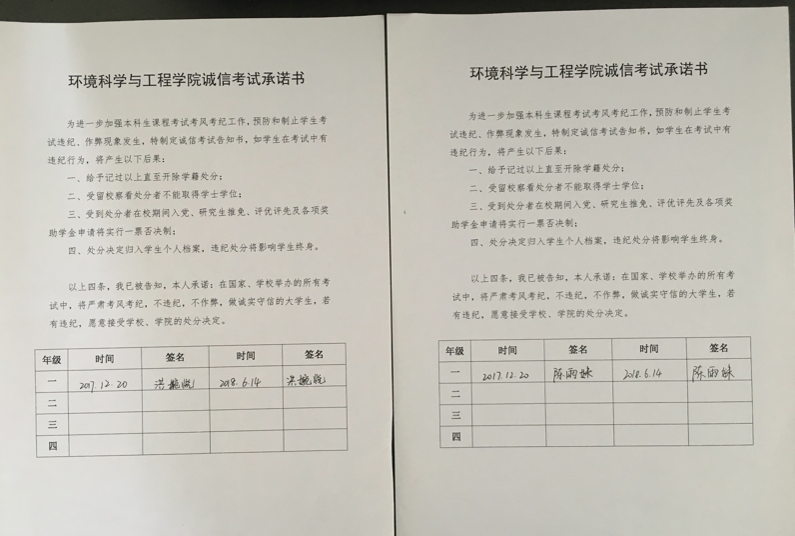 本网讯(环工学院 郑合庆)学以载道,诚信为本。自6月开始,环工学院面向全院学生开展了以诚信考试为主题的系列教育活动,鼓励学生们将诚信贯彻到一言一行中,不越道德底线,树立良好的考风和校风。