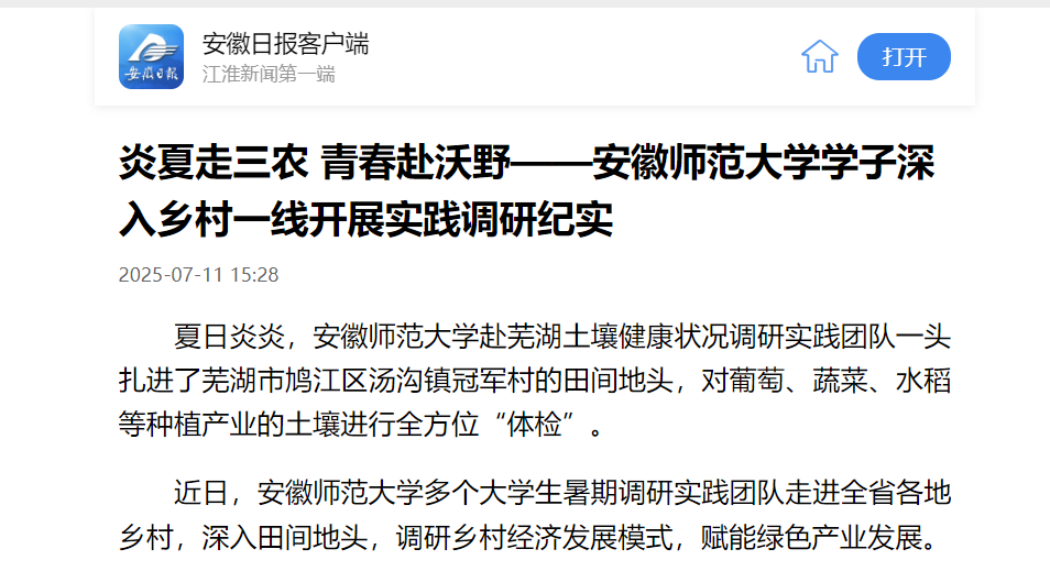 近日,安徽师范大学多个大学生暑期调研实践团队走进全省各地乡村,深入田间地头,调研乡村经济发展模式,赋能绿色产业发展。