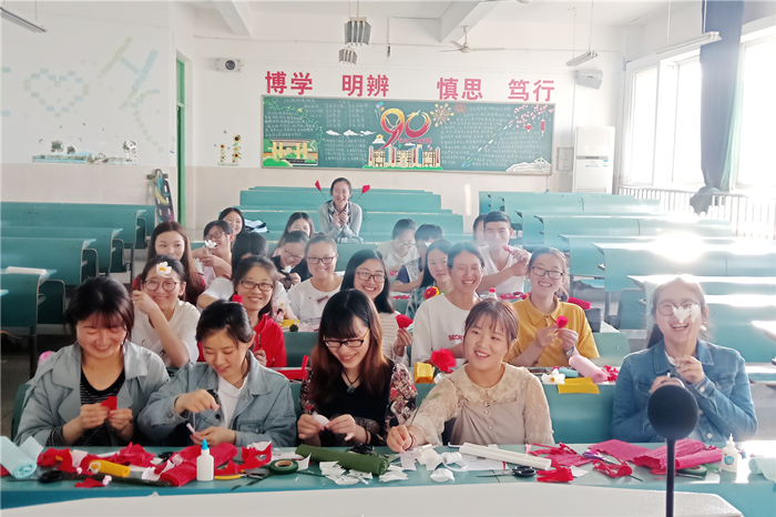 活动开始,金凤仙就活动意义做出解释。手工活动可以成为生活中合理的解压方式,手随心动的过程中大脑得以放松、疲劳得以缓解,能够静下心来思考自我的状态。集体的互动能够促进人际间沟通,完成的作品能够激发自己的成功体验。活动还特邀学工处研究生助管施惠学姐教授大家手工花做法,在学姐耐心的指导下,同学们裁剪、粘接,很快学会了制作不同种手工花的方法,短短的两个小时,做出了纯粹的满天星、清雅的马蹄莲、炽热的玫瑰、烂漫的小雏菊……最后,全体人员拍合照留念,将自己精心制作的花朵或赠与好友,或装饰寝室。