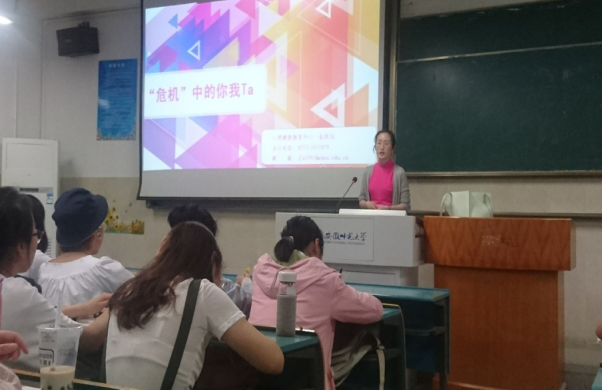 金老师的讲座围绕三个关键词:“危机中的我们”、“危机中的Ta们”“危机中的我们和Ta们”进行展开。“危机中我们应该怎么做?”讲座一开始,金老师提出这个问题引导与会同学思考,老师告诉大家在遇到危机时应及时向辅导员或心理健康中心老师汇报,而不是自行私下处理,造成不必要的麻烦。接着,金老师为大家播放了时长几分钟的短视频,在吸引大家注意力的同时也强调了不要随便给“Ta们”贴标签,同学之间应该相互理解和包容。讲座最后,金老师提出了“陪伴是最长情的告白”,并鼓励与会同学相互扶持,多关心身边的“Ta们”,将“我们”微薄的力量汇聚成足以温暖“Ta们”的源泉。