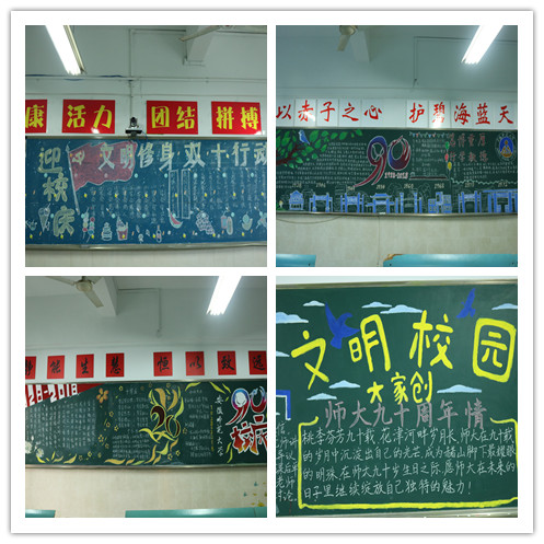 校园文明创建。教室板报和宣传橱窗布置。5月9日前,学生会学习部和各班委完成了责任教室黑板报和宣传橱窗的布置工作。学院所有责任教室和宣传橱窗,结合专业特色、文敏修身教育和校庆内容,均进行了重新布置和美化。一幅幅精美的板报,一幅幅精美的宣传画,成为一道道美丽的校园风景线。最青春主题寝室文化节。5月13日下午,学院开展了文化节主题寝室创建评比活动。一间间干净整洁、装扮精致的寝室,无不彰显同学们团结一心、互助协作的集体荣誉感和积极投身校园文明创建的精神。光盘“型”动。4月11日,食品安全与营养协会在花津校区一食堂和二食堂开展了光盘“型”动。志愿者们在食堂门口向同学们讲解健康饮食知识,在食堂窗口引导同学们排队打饭,向就餐的同学们发起光盘倡议等,宣传爱粮节粮理念,引导同学们文明有序就餐、爱护食堂设施。