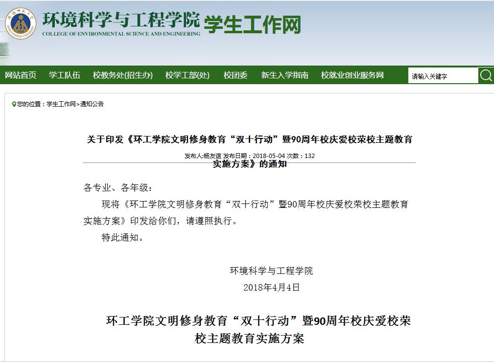 制定工作方案。4月初,学工组在学院党政领导班子的指导下,制定了《环工学院文明修身教育“双十行动”暨90周年校庆爱校荣校主题教育实施方案》,设计了校史校情和院史院情主题班会、校园文明创建和特色主题活动三大模块,共计8项校园文化活动,努力做到契合节点,点面结合,创新形式,增强活动的针对性和实效性、感染力和影响力。