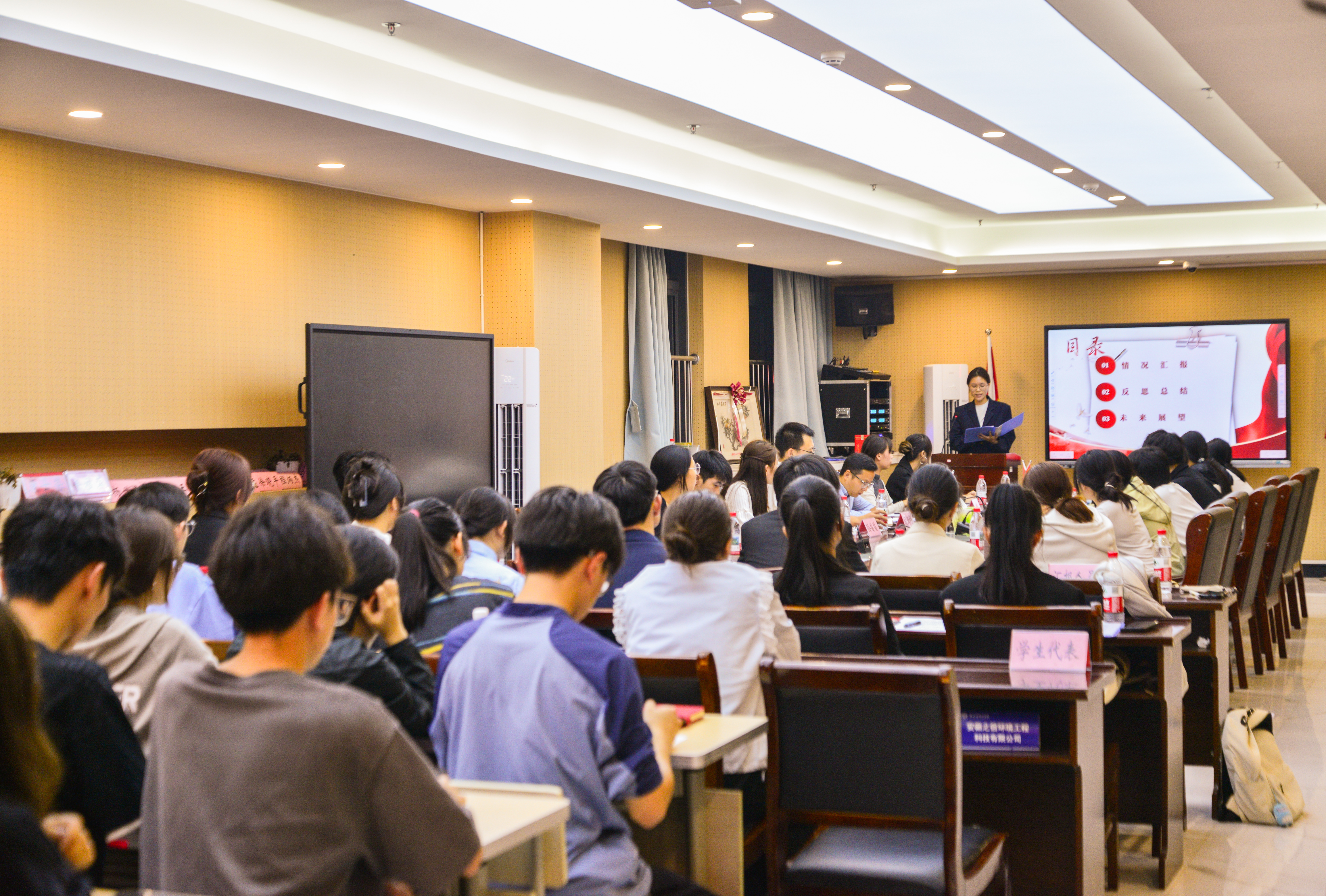 为全面总结学生组织工作成效,明确发展方向,增强组织运行透明度与成员责任感,2025年10月15日晚,学院在清源楼B305会议室召开2024-2025学年学生会述职评议会。学院党委副书记张海兵,校学生会主席团成员、2023级食品科学与工程专业张明倩,院团委书记屈亚舒,辅导员刘姣姣、高飞月、孙苗苗、罗婷宇参加会议。院学生会主席团成员、院团委委员、环境与健康协会会长、蒲公英环保学校协会会长、团委学生会各部门负责人及学院学生代表参加活动。会议由团委委员李宜诗岚主持。