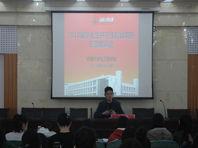 (本网讯/环工学院)为帮助考研学子精准掌握研究生调剂相关政策,3月14日下午学院在财务处二楼报告厅,举办了2018届毕业生就业系列活动——考研调剂报告会。校研究生学院招生办公室凌从祥老师为同学们答疑解惑,123名同学参加了培训会。会议由辅导员童华卿主持。。