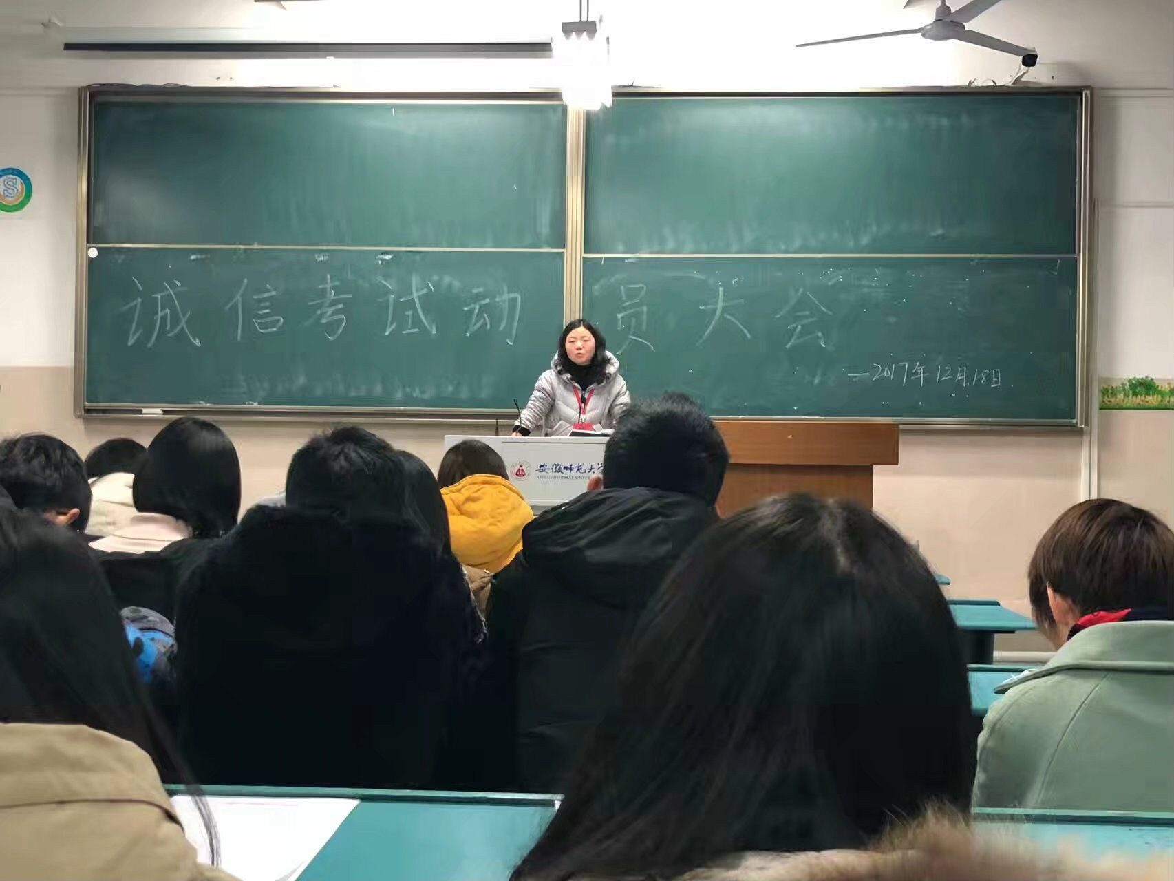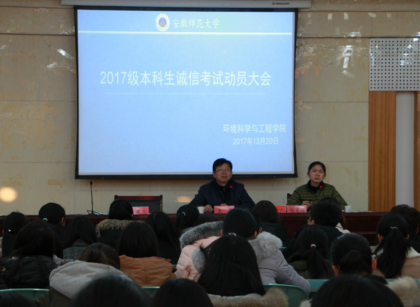 全院动员,提高认识。学院于12月20日下午在财务处二楼报告厅召开2017级学生诚信考试动员大会,院党委书记王峰为17级全体学生做诚信考试动员讲话,会议由院党委副书记杨友谊主持,17级辅导员和全体2017级学生参加。会上,杨友谊宣读了《安徽师范大学考试纪律及违纪作弊处罚规定》。王峰强调了学院对考风考纪工作的重视,提醒同学们要理性的对待考试,切勿违反考场纪律,要把考试当作检查自身不足的契机,用成绩衡量自我学习情况。最后,他希望同学们牢记考试纪律,端正考风,科学复习,认真备考,考出优异成绩。