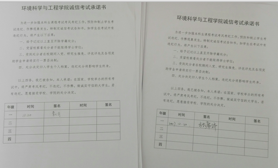 诚信考试,郑重承诺。期末考试是对知识和能力水平的检验,也是对道德和诚信的考验。学院印发《诚信考试承诺书》,承诺书中详细地列出了考试违纪将产生的后果。同学们仔细阅读告知书,郑重地签下了自己的名字。