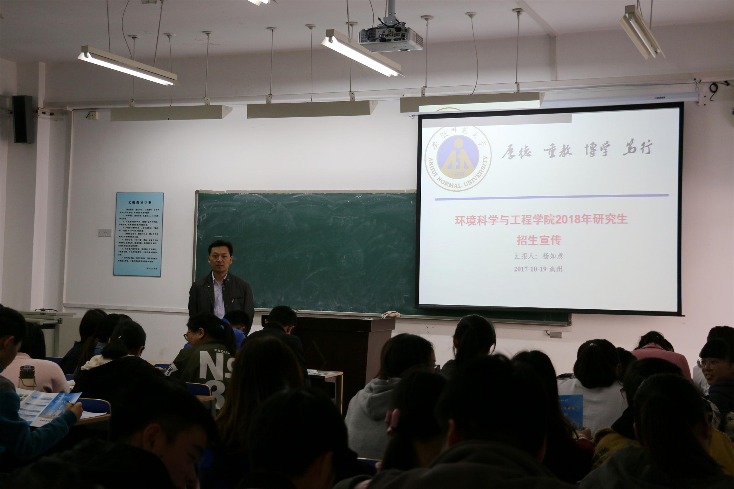 杨如意教授、吴婷教授、王波副教授三位学位点负责人,分别赴安庆师范大学、池州学院、宿州学院等兄第高校,宣讲2018年环工学院研究生招生政策,针对学生最为关注的就业前景、招生计划、初试与复试准备等问题进行了细致耐心的解答和说明。为了让广大考生更好地了解学院的研究生培养情况,环工学院印制了精美的宣传材料,从学科概况、科研创新平台、科研条件、科研队伍、科研项目与成果、科研合作与交流、社会服务、研究生奖助体系、2018年招生计划等方面系统介绍了学院的发展历程、学科定位、研究方向和办学特色。同时,学院更新优化了招生网站,进一步丰富了培养方案、科研平台、研究生导师等相关信息。学院还向省内外40余所高校邮寄招生简章100多份。