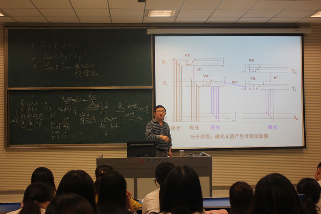 每位主讲教师课前都进行了精心准备,课堂上以饱满的精神状态、丰富的教学内容和扎实的教学基本功展示了各自的教学特色和风采。周守标老师专业知识丰富,能将枯燥的理论与实例相结合,与自身的科学研究相结合,对于帮助学生理解概念、拓展学生眼界、培养学生的科学素养起到了很大的推动作用。王波老师教态自然,语调抑扬顿挫,课程讲解清楚,授课极具感染力,她注重培养学生解决问题的能力,提升了教学效果。程新峰老师教学准备充分,重点突出,板书和多媒体课件相互补充,便于学生更好的理解课程内容。赵广超老师用设问的方式,围绕课程伊始提出的三个问题,用一张张生动简明的图例层层递进,深入浅出的介绍了荧光和磷光光谱法的基本原理。整个教学过程前后呼应、逻辑清晰,教学语言简洁严谨,教学安排合理,充分展示了他深厚的教学功底。观摩活动后,学院及时地组织了评议活动,研讨教学设计和教学方法,交流教学技能和教学经验。大家一致认为授课教师在课程准备、内容讲授、知识拓展等方面表现出较高的教学水准,达到了良好的示范作用。