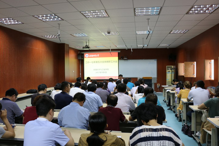 本网讯(环工学院党委)为扎实推进新学期工作的开展,9月6日下午,环境科学与工程学院在学院一楼会议室召开本学年第五次教职工大会,部署学院新学期工作。大会由学院党委书记王峰主持。