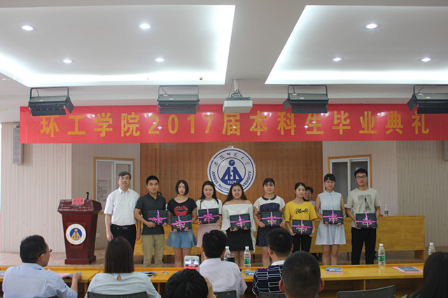 王绍武副校长宣读《关于聘任2017届校友联络员的决定》,并为环工学院2017届校友联络员颁发聘书。接下来,王绍武代表学校向环工学院2017届毕业生表示热烈的祝贺,向为毕业生成长付出心血和汗水的家长、老师和同志们致以崇高的敬意。他送给毕业生一句话:擦亮人生底色,努力做最好的自己,并表达了三层意思:一、愿大家始终保持做人的底色,把高尚人格作为永恒的追求;二、愿大家始终保持生活的热情,把生活作为人生的主线;三、愿大家始终保持我校人的情怀,把我校精神作为一路向前的动力。他祝愿每一位毕业生在将来的人生道路上都能遇见最好的自己,都能拥有自己的美好人生!最后,王绍武为毕业生代表颁发了毕业证书和学位证书,并合影留念。