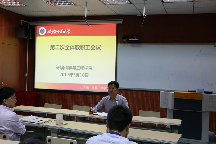 本网讯(环工学院党委)2017年5月10下午,环境科学与工程学院在学院行政楼一楼会议室召开全院教职工大会,重点传达学校“四个专项治理”工作会议精神,布置和通报学院近期工作。会议由学院党委书记王峰主持。