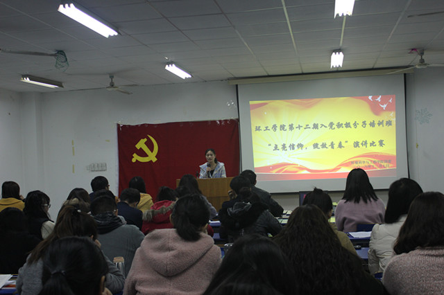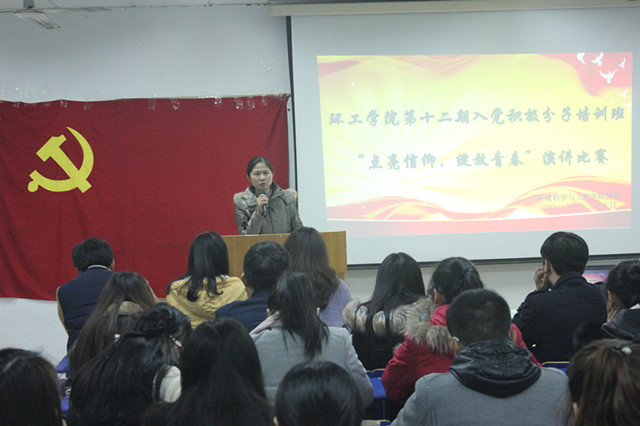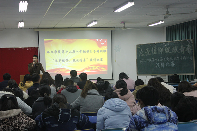 (环工学院分党校)12月7日晚7点,环工学院入党积极分子培训班在学院实验楼201教室举办“点亮信仰,绽放青春”主题演讲比赛。学院党委副书记杨友谊、13级辅导员陈潘、14级辅导员童华卿、学院兼职辅导员王斌,学生党员代表朱一芝应邀担任评委,培训班全体学员到场观赛。