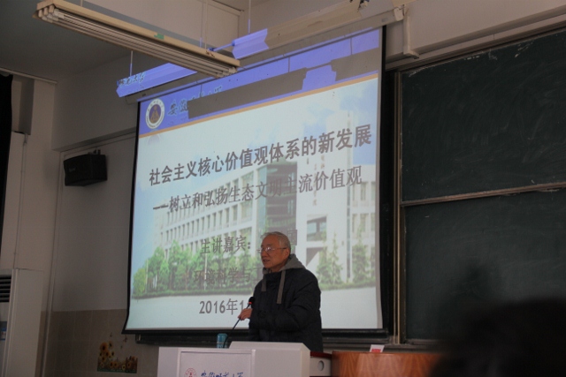 (环工学院 李霞光)11月28日下午,环工学院邀请校关工委宫世国教授为2016级新生做了题为《社会主义核心价值体系的新发展——树立和弘扬生态文明主流价值观》的专题报告。辅导员李霞光老师主持了此次报告会。