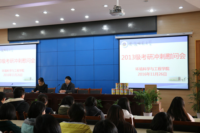 11月26日下午,环工学院在校圆形报告厅召开2013级学生考研冲刺慰问会。学院院长周守标、党委副书记杨友谊与全体备考同学共话考研征程,为同学们送去冬日温暖。