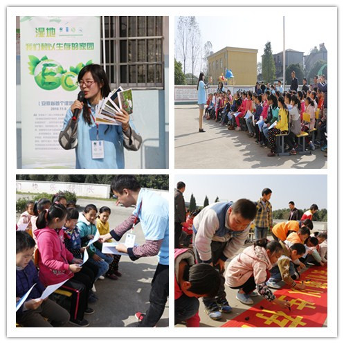 受GEF项目委托,安徽师范大学环境与健康协会两任会长以及蒲公英环保学校宣教成员携手经致传媒,赴池州市升金湖国家级自然保护区,针对周边校园及社区开展了湿地保护宣教活动。升金湖国家级自然保护区为永久性淡水湖泊湿地,位于池州东至县境内,是水禽赖以生存的天然场所、中国主要的鹤类越冬地之一、是世界上种群数量最多的白头鹤天然越冬地,也是安徽省首个荣获国际级称号的自然保护区,因此升金湖亦有“中国鹤湖”之称。升金湖自然保护区的主要保护对象为湿地生态环境及越冬水禽。在升金湖畔的东至县大渡口新丰圩小学,环协的宣教成员们利用专业所学,通过宣讲、问答、游戏等生动形象的方式,让该校的学生轻松地了解到了保护湿地、爱鸟护鸟的有关知识,受到了当地师生的欢迎,反响十分热烈。该活动受到了当地师生的热烈欢迎,《大江晚报》对该活动也进行了详细报道。该宣教项目是中国全球环境基金项目(GEF)第五期的子项目,也是迄今我省湿地保护方面最大的国际合作项目。