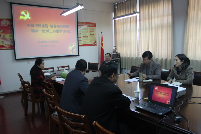 本网讯(环工学院党委)11月2日下午,环境科学与工程学院党委组织开展了“两学一做”学习教育第三专题学习讨论,学院党委委员围绕“坚守纪律底线,培养高尚情操”开展了深入的讨论交流。