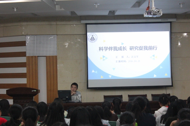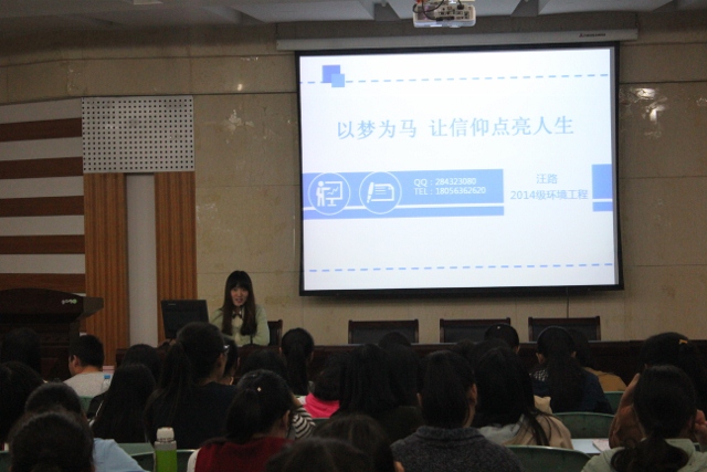 (环工学院 文/李霞光 图/王翔宇)10月20日晚,环工学院在花津校区财务处二楼报告厅举办”奋斗的青春最美丽——青春导航”报告会,辅导员李霞光老师和2016级全体新生参加。报告会邀请了在学习、工作、科研方面取得优异成绩的2013级环境工程专业陈晓、汪文军和食品质量与安全专业滕梦静,2014级环境工程专业汪路等4位同学,为2016级新生传授经验、答疑解惑。