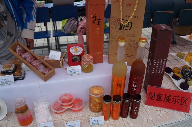 专业创新与美食相结合。展示区开辟了体现了环工学院食品专业学生专业创新的作品区域。创意展示区摆放着自上学期以来,学院老师指导学生制作的参加安徽省食品创意大赛和华东片高校食品创意大赛的红粬酒、蜂蜜酒、荷粉包子、冰皮刺梨月饼、黄精糖醇枣糕、干果奶冻等12种创意食品,体现了学生过硬的专业技能和创新意识。