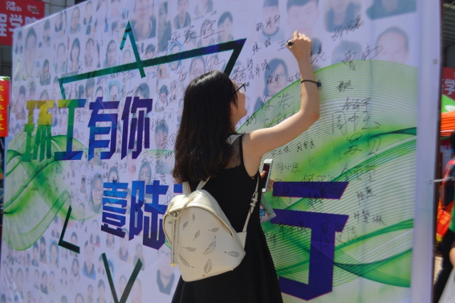学院在迎新现场搭建印有全体2016级新生照片的“环工有你,壹陆前行”签名墙,用最时尚的签名方式让新生留下入学后的第一个珍贵瞬间。新生在办理完报到手续后纷纷在签名墙上签字并和家长合影留念。一个个个性飞扬的签名、一张张洋溢着幸福的笑脸,成为迎新现场最难忘的画面。