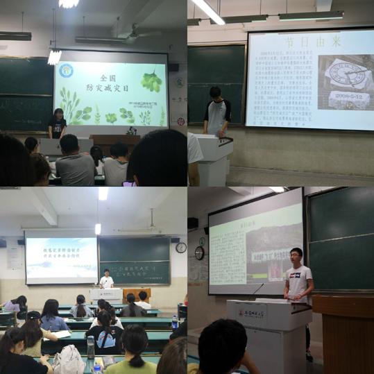 5月12日晚,2018级本科生各班级开展了“防灾减灾”宣传教育主题班会,班会由各班班长主持。活动伊始,主持人通过生动、直观的图片,详细介绍了防灾减灾日的由来以及防灾减灾的知识技能、应对措施和相关案例。同学们还通过观看视频,了解了地震,洪水,飓风等灾害发生时的自救办法和注意事项。