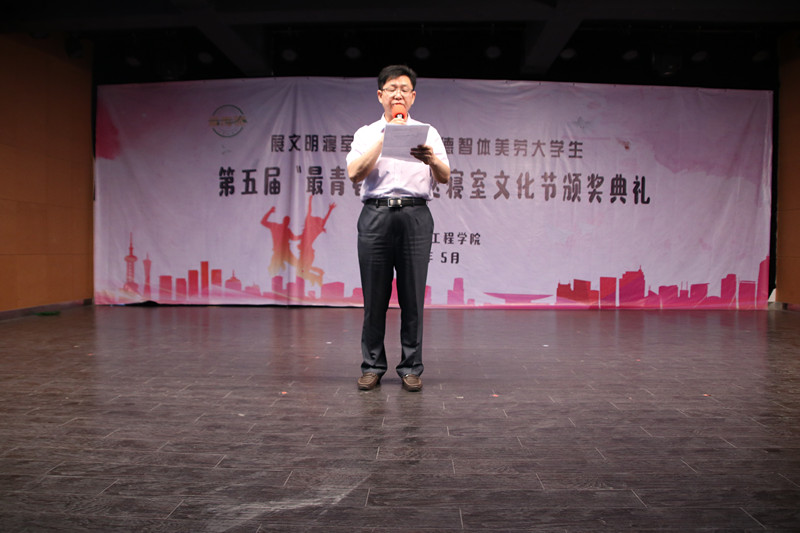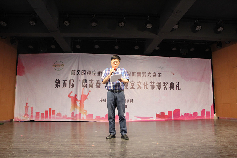 本网讯(环工学院 付佳慧)青春环工,你我同行。5月22日晚19:00,学院在团委多功能厅举办第五届“最青春”寝室文化节颁奖典礼。学院党委书记王峰、院长周守标、校党委宣传部副部长詹剑峰、校学生工作处副处长张玉新、后勤管理处副处长李靖宇、校团委副书记汪凯和学院党委副书记杨友谊出席典礼,各年级辅导员、各参评寝室成员及一二年级寝室长参加。