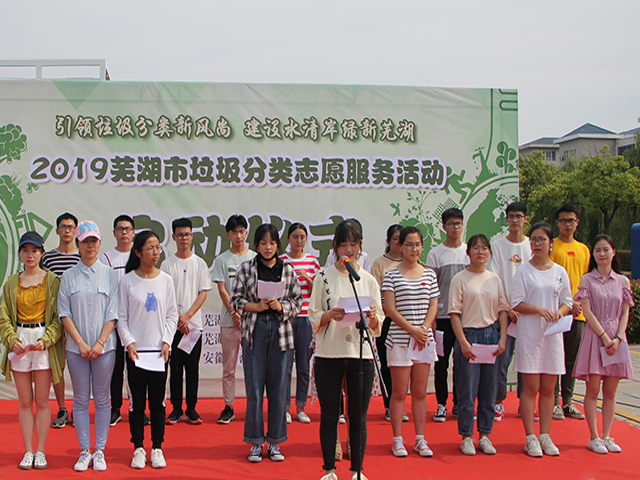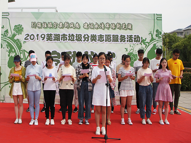 致辞结束后,主持人宣读了首批芜湖市垃圾分类志愿者名单,20名志愿者上台宣誓,表达了自己参与垃圾分类志愿服务的决心。志愿者代表崔伟丽同学发言,她表示,爱护环境、改善环境是我们每个人的事情,号召同学们从自身做起,作环境保护的先行者、宣传者,用实际行动为美丽芜湖建设作出积极贡献。