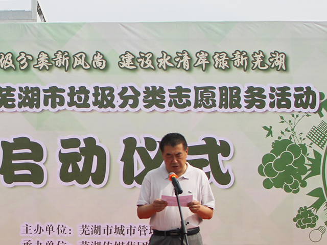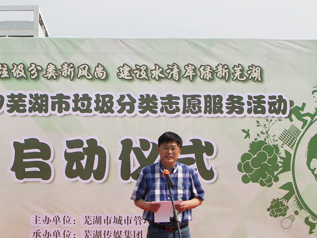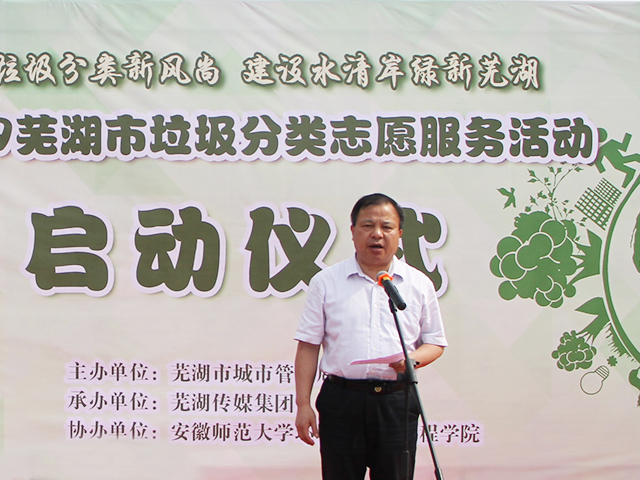 仪式伊始,芜湖市传媒集团党委委员高成上台致辞,他对芜湖市垃圾分类工作表示充分的肯定和支持,希望能通过志愿服务活动让更多人了解垃圾分类,为建设美丽芜湖添砖加瓦。随后,环工学院院长周守标上台致辞,他表示,开展芜湖市垃圾分类志愿服务是一项非常有意义的活动,他希望环工学子能利用所学知识积极服务社会,发挥吃苦耐劳、甘于奉献、团结协作的精神,投身生态文明建设,为建设生态文明社会做贡献。接着,芜湖市城市管理局副局长陈开宏宣布芜湖市垃圾分类志愿服务活动正式启动,呼吁大家引领垃圾分类新风尚,建设水清岸绿新芜湖。